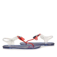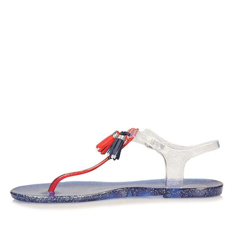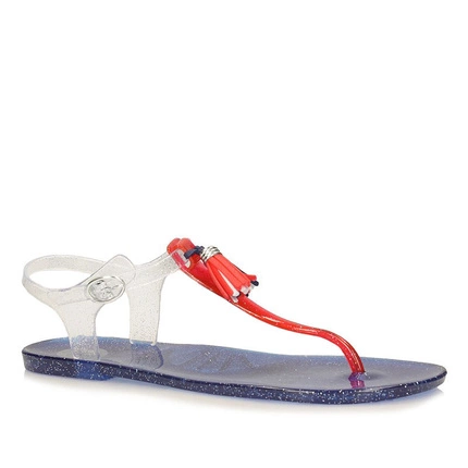 W najnowszej kolekcji hiszpańskiej marki Gioseppo królują przezroczystości oraz transparentne pastelowe odcienie, które nadają obuwiu ciekawego, awangardowego charakteru. Tym razem projektanci proponują nam nawiązujący swoją kolorystyką do marynarskiego model sandałków w brokatem w roli głównej. To wszystko sprawia, że japonki idealnie podkreślą wakacyjny charakter każdej stylizacji. Całość wykonano z wysokiej jakości tworzywa gumowego o doskonałych właściwościach. Tego typu mieszanka nie powoduje żadnego dyskomfortu, odparzeń czy otarć podczas użytkowania. Poza tym jest szczególnie praktyczne i łatwe w utrzymaniu czystości. Dla właściwego dopasowania z boku kostki umieszczono metalową sprzączkę z boku kostki.