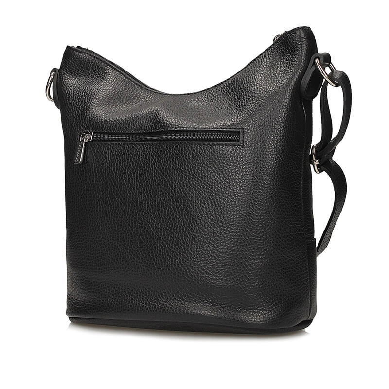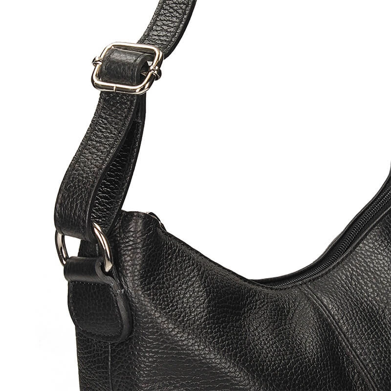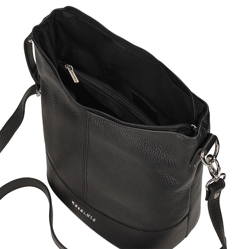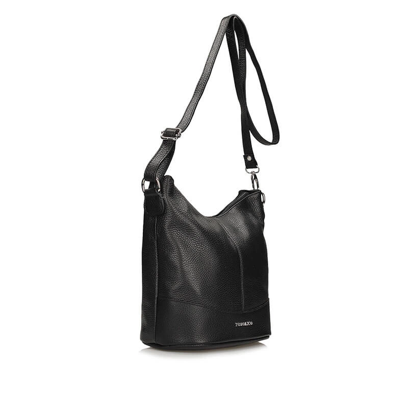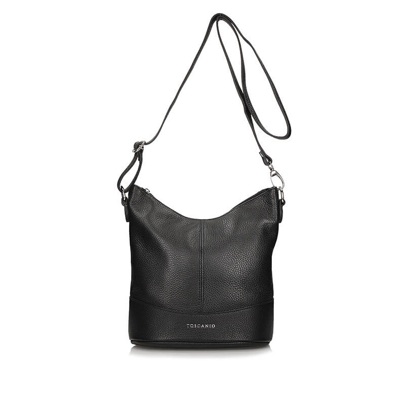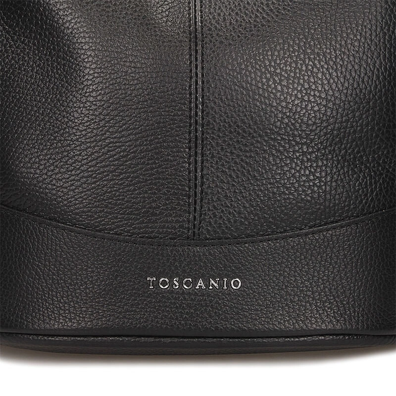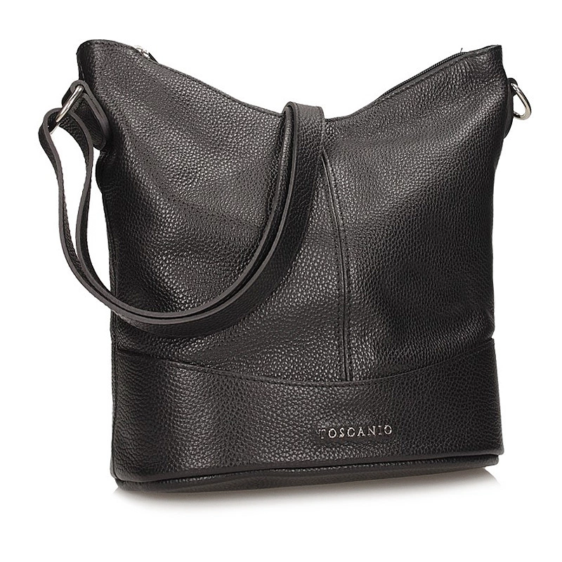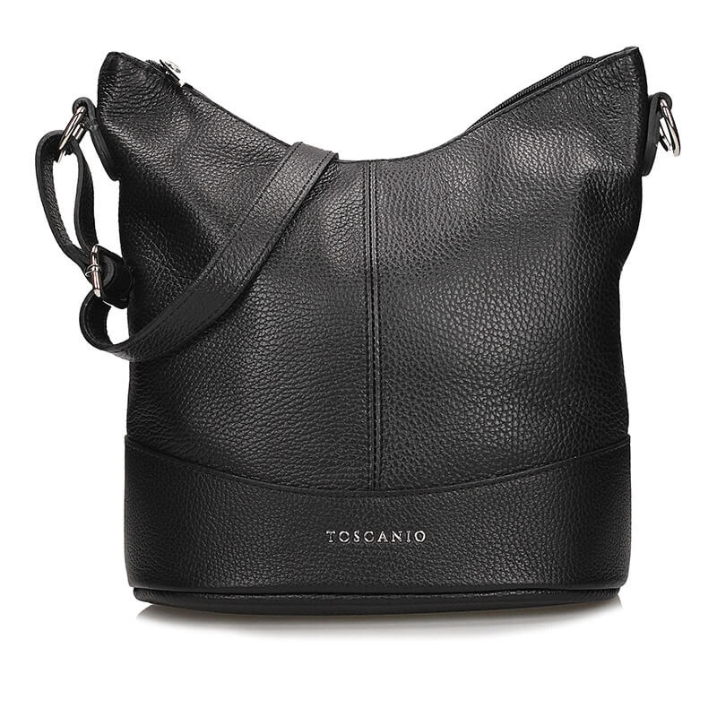 Torebka typu worek to propozycja od włoskiej marki Toscanio. Czarny wierzch wykonany został z wyselekcjonowanych skór licowych. Fason dwukomorowy zapinany na zamek błyskawiczny. Komory oddzielone zostały podszewką posiadającą większą kieszeń. Wewnątrz znajdują się mniejsze kieszonki idealne na nasze dodatki typu kalendarz, telefon bądź też klucze. Pasek regulowany umożliwiający noszenia torebki na ramieniu. Czarny kolor genialnie skomponuje się z wieloma stylizacjami.