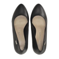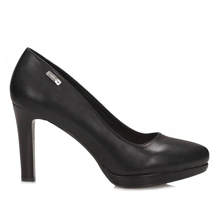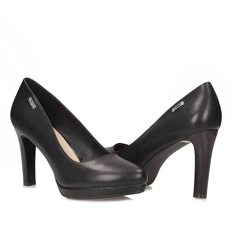 Cholewka wykonana ze skór ekologicznych licowych gwarantuje jednolitą, głęboką czerń oraz łatwość pielęgnacji; obcas o wysokości 9,5 cm z platformą dodaje proporcji sylwetce, jednocześnie poprawiając stabilność. Świetnie komponują się z garsonką w pracy, a także z koktajlową sukienką na wieczorne wyjście.