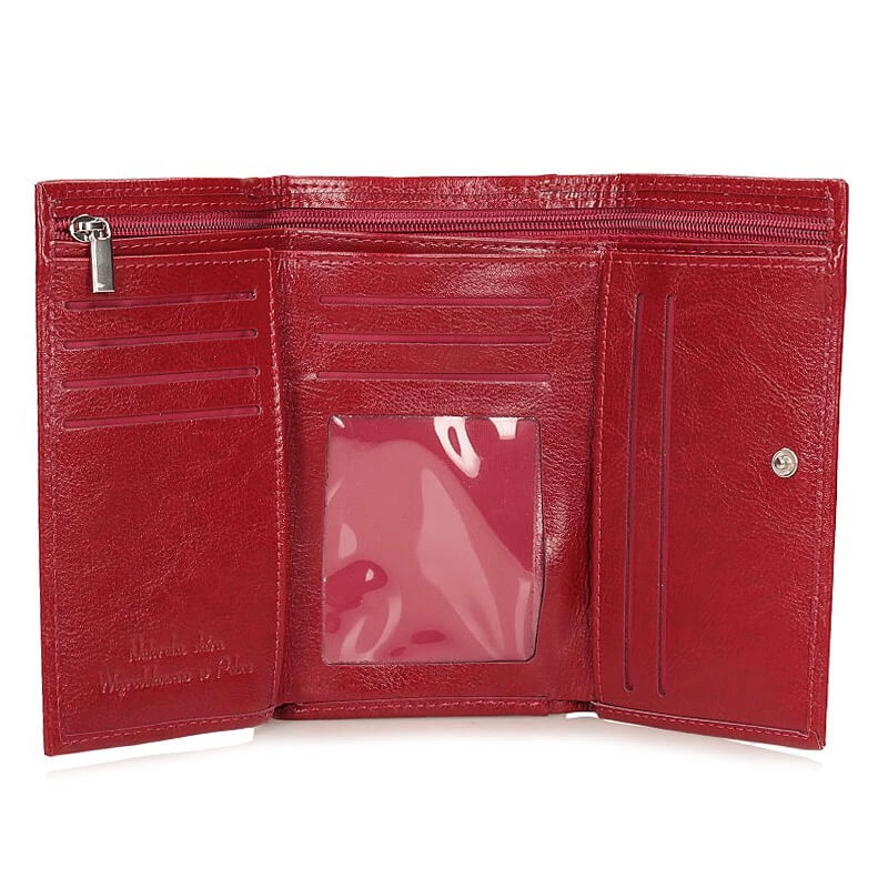 Marka Giorgio Bassani stawia na klasykę oraz staranne wykończenie. Ich nowa propozycja to piękny czerwony portfel w całości wykonany z naturalnej skóry licowej. Model ten jest bardzo pojemny, posiada 13 miejsc na karty, miejsce na zdjęcia oraz przegrody na banknoty i dokumenty. W tylnej części portmonetki umiejscowiona została osobna kieszonka na bilon zapinana na srebrny bigiel. w przedniej części znajdziemy małe, wytłoczone logo firmy. Portfel spodoba się zapewne szerokiemu gronu klientów ceniących klasykę i dbałość o szczegóły.