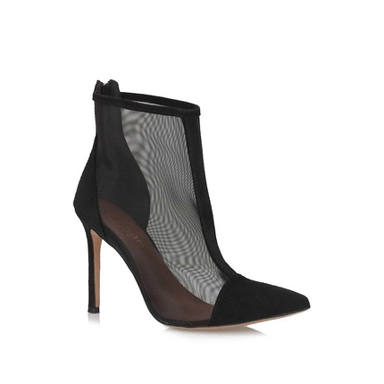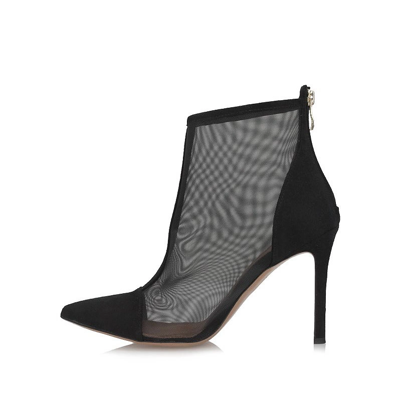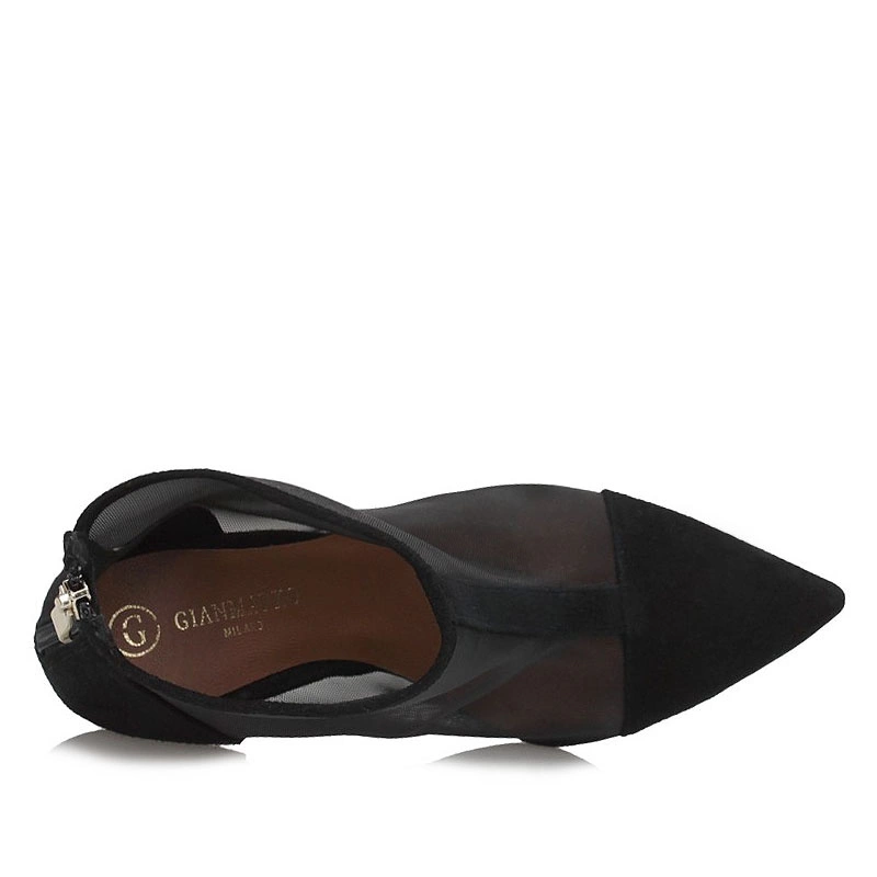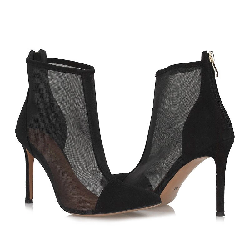 Marka Gianmarko, która skradła wiele serc naszych klientek ma dla naszych Pań genialny fason sandała na szpilce. Cholewka w odcieniu ponadczasowej czerni wykonana została z wysokogatunkowego tworzywa czyli delikatnej, ciemnej siatki oraz z wstawkami skóry naturalnej zamszowej. Nosek w szpic, optycznie wysmukla naszą stopę. Dla lepszego użytkowania producent wszył zamek błyskawiczny, który ułatwia zakładanie oraz ściągnie botków. Wnętrze zostało wykonane z naturalnej skóry. Szpilka o wysokości 9,5 cm obciągnięta została skórą w kolorze cholewki, co nadaje botkom charakteru i kobiecości. Model genialnie skomponuje się z wieloma stylizacjami.