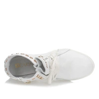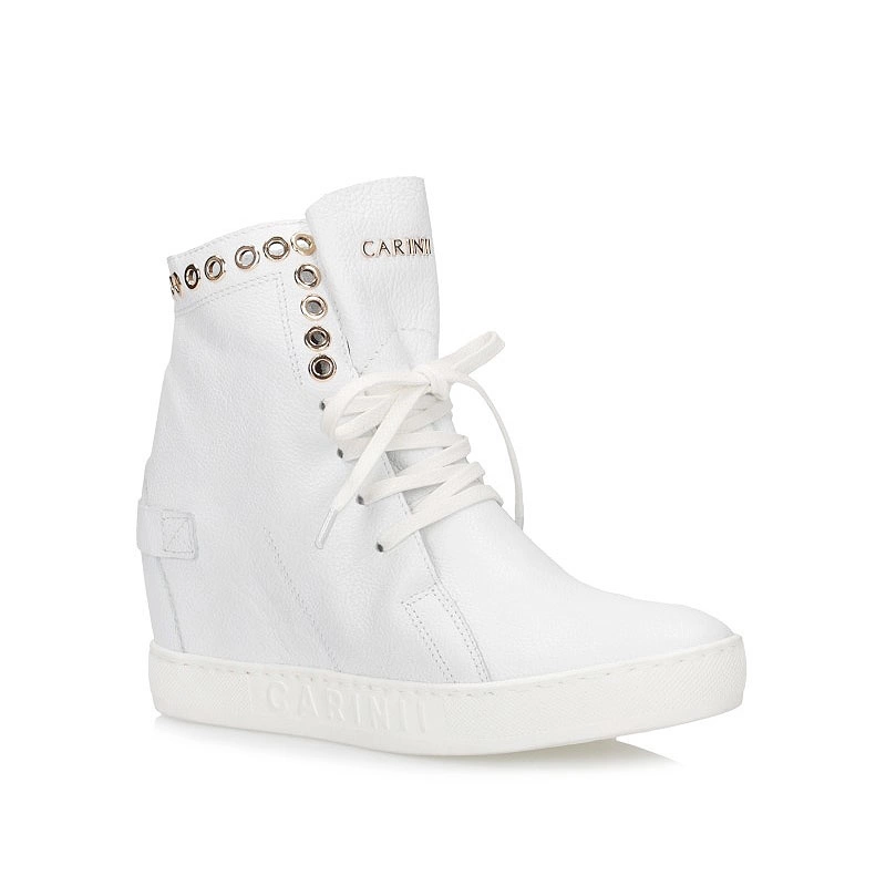 Producent marki Carinii wyprodukował botki Sneakersy w kolorze białym. Obuwie zostało oparte na koturnie. Cholewka wykonana z naturalnej skóry licowej. Posiada również po boku zapięcie zapinane na solidny zamek oraz posiada przód sznurowany, co sprawi lepsze dopasowanie obuwia do stopy. Wnętrze zostało wyściełane naturalną skórą. Nosek zaokrąglony, lekko uniesiony ku górze. Całość oparto na ukrytym, stabilnym klinie o wysokości 8,5 centymetrów. Obuwie świetnie będzie pasować do oryginalnych, szalonych stylizacji zarówno nastolatek jak i dorosłych kobiet.