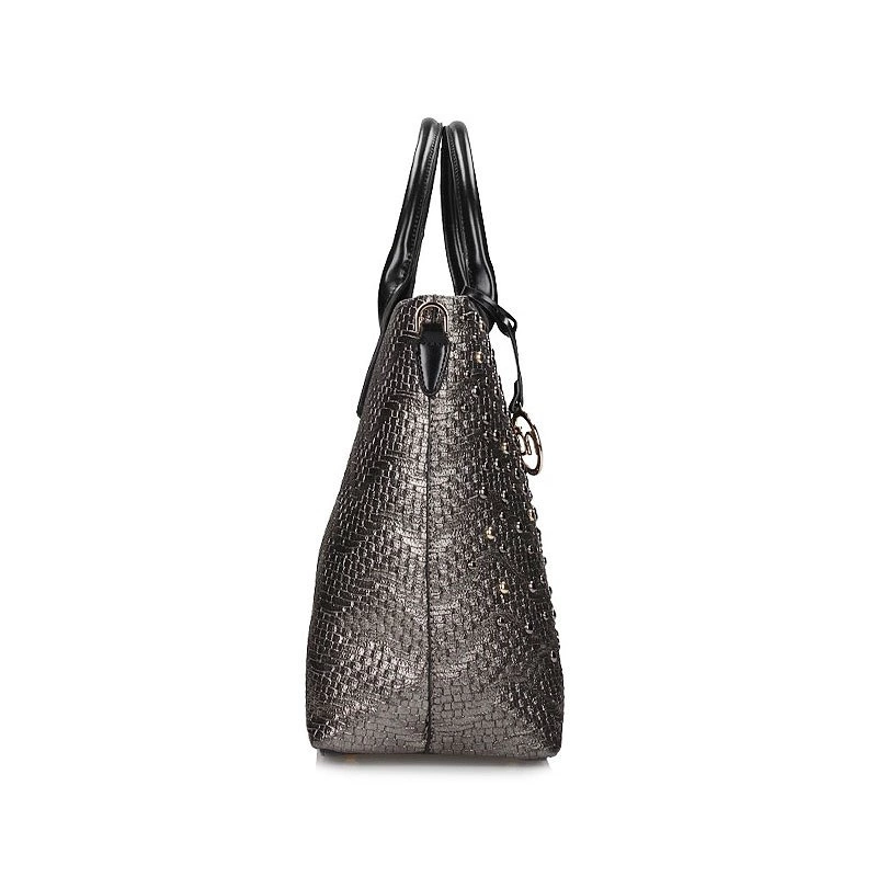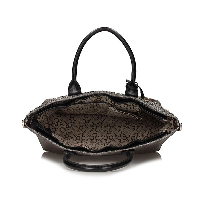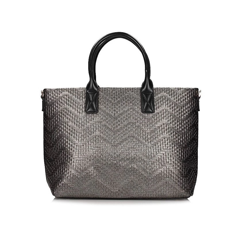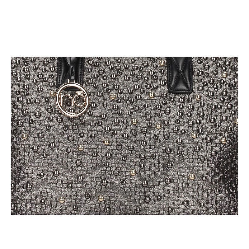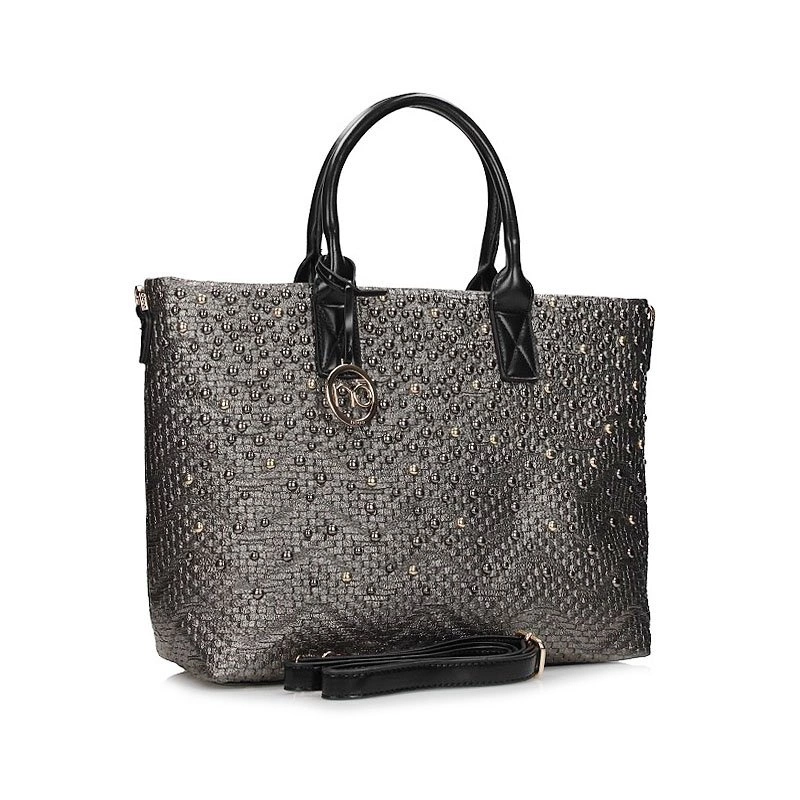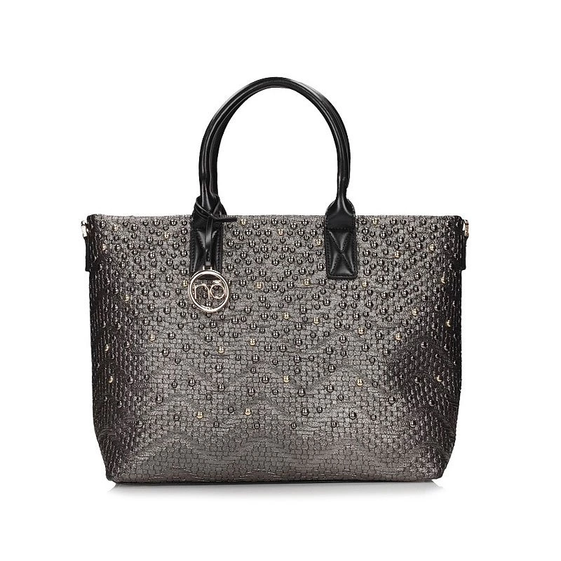 Niestandardowy i bardzo ciekawy model torebki wykonała znana i lubiana przez klientki marka Nobo. Torebka powstała z wysokiej jakości skóry ekologicznej w pięknym odcieniu szarości z dodatkiem klasycznej czerni. Model ten zdecydowanie wyróżnia się oryginalnymi dżetami, które umieszczono na całej przedniej stronie torebki. Wewnątrz jednokomorowa z dodatkowymi kieszeniami na kobiece drobiazgi. Zapinana na zamek. Do torebki dołączono również długi pasek z możliwością regulacji. Ta funkcjonalna i pojemna torebka została dopełniona brelokiem z logo marki.