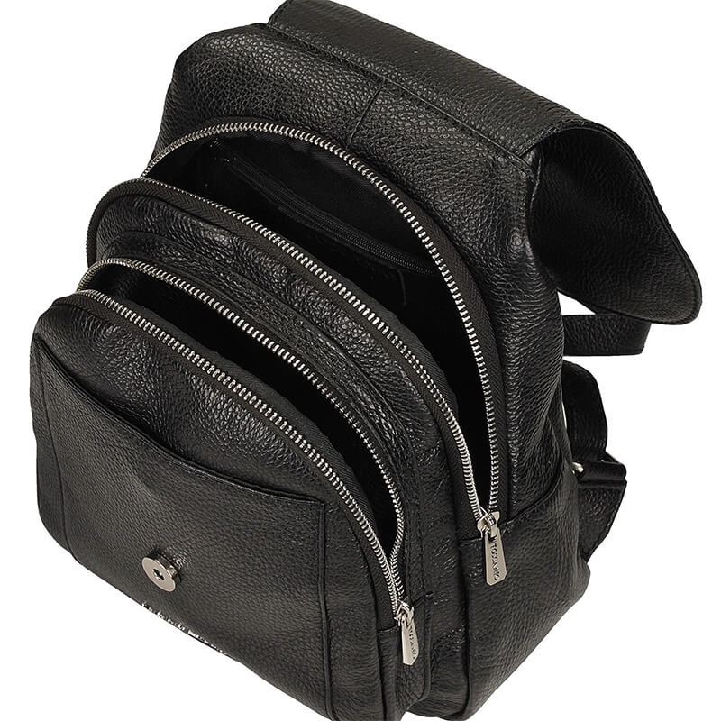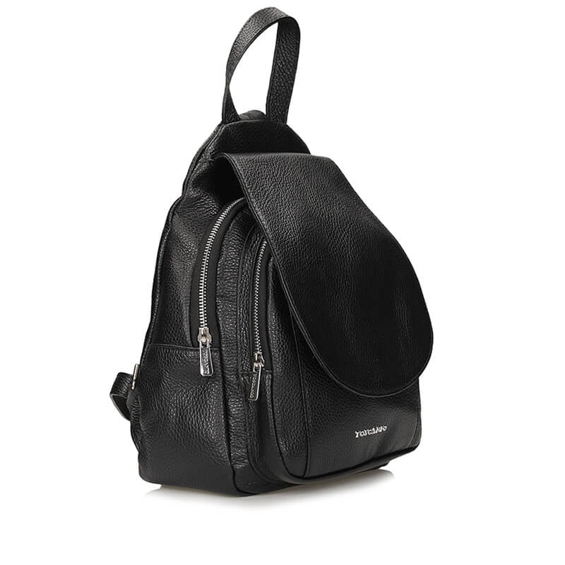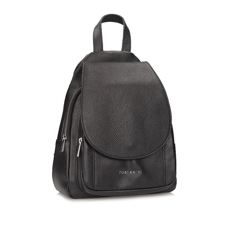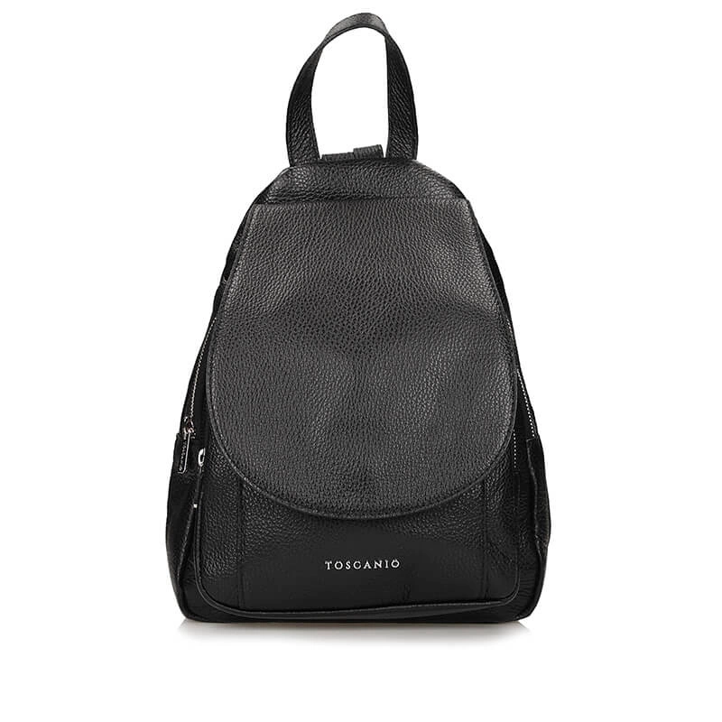 Marka Toscanio przedstawia plecak wykonany z wysokogatunkowej skóry naturalnej w klasycznym odcieniu czerni. Posiada oddzielne dwie komory zapinane na błyskawiczny zamek, wewnątrz jednej są małe kieszonki na zewnątrz również znajduje się większa kieszonka. Posiada klapkę zapinaną na zatrzask. Plecak posiada szelki umożliwiające regulacje.