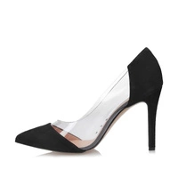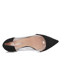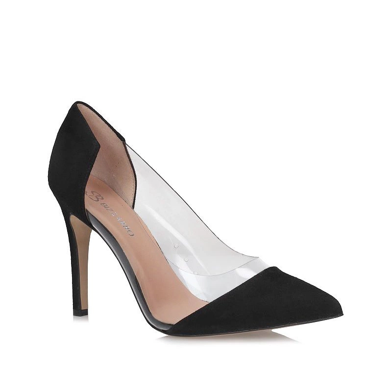 Dla Pań lubiących oryginalne wzory obuwia mamy model marki Bizzarro wykonany zgodnie z najnowszymi trendami. Przód cholewki oraz pięta wykonana z naturalnej zamszowej skóry w klasycznym czarnym  kolorze. Środek cholewki wypełniony przezroczystym silikonem, który wspaniale podkreśla piękno damskiej stopy. Nosek w delikatny szpic, idealnie wysmukla stopę. Zakładając prezentowany model mamy pewność, że będziemy wyglądać modnie i wzrok zarówno damskiej jak i męskiej części będzie zwrócony na naszą osobę. Ciekawa, zgrabna szpilka o wysokości 10,7 cm to również duży atut modelu. Wewnątrz naturalna wkładka, która dla większego komfortu została podklejona miękką pianką. Podeszwa wykonana z tworzywa sztucznego, odpornego na ścieranie.