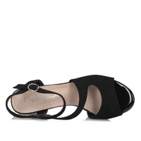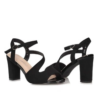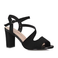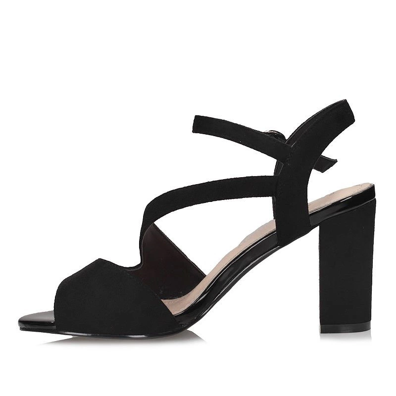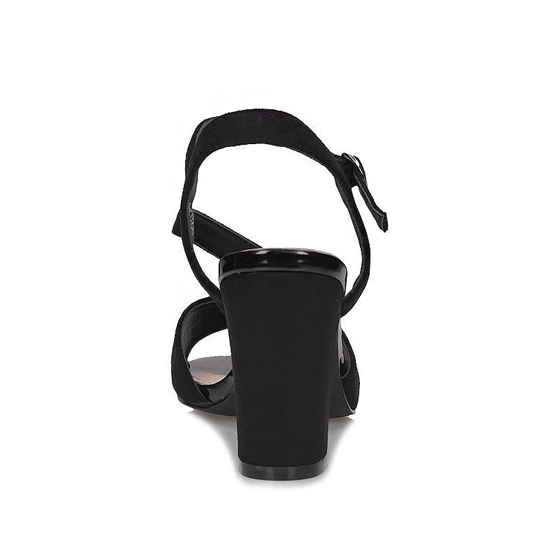 Eleganckie sandały na obcasie, w klasycznej czerni, marki Sergio Leone. Cholewka wykonana z ekologicznej skóry zamszowej. Model zapinany na srebrną sprzączkę. Miękka wkładka została wykonana z naturalnej skóry, która pozwalana większy komfort oraz wygodę podczas wielogodzinnego użytkowania. Całość oparta jest na obcasie słupkowym o wysokości 9 cm,co pozwala na stawianie pewniejszych kroków. Podeszwa z trwałego tworzywa, odpornego na ścieranie. Model sandałów idealnie będzie pasował do sukienek jak i spodni.