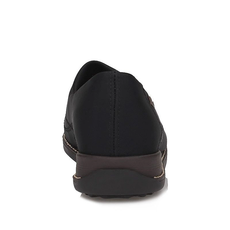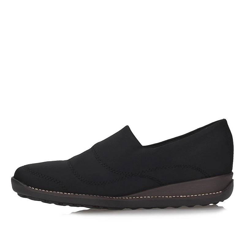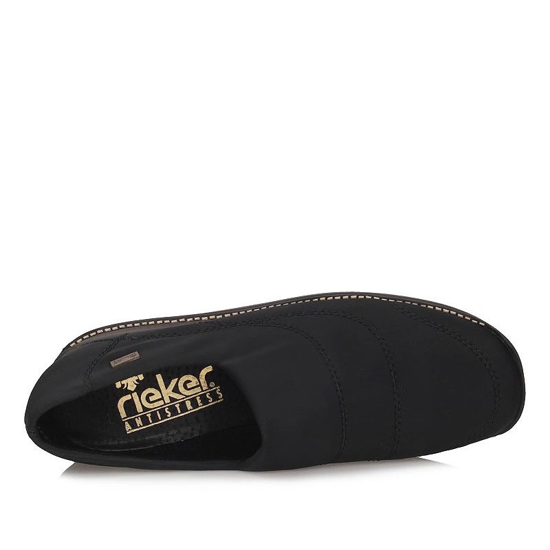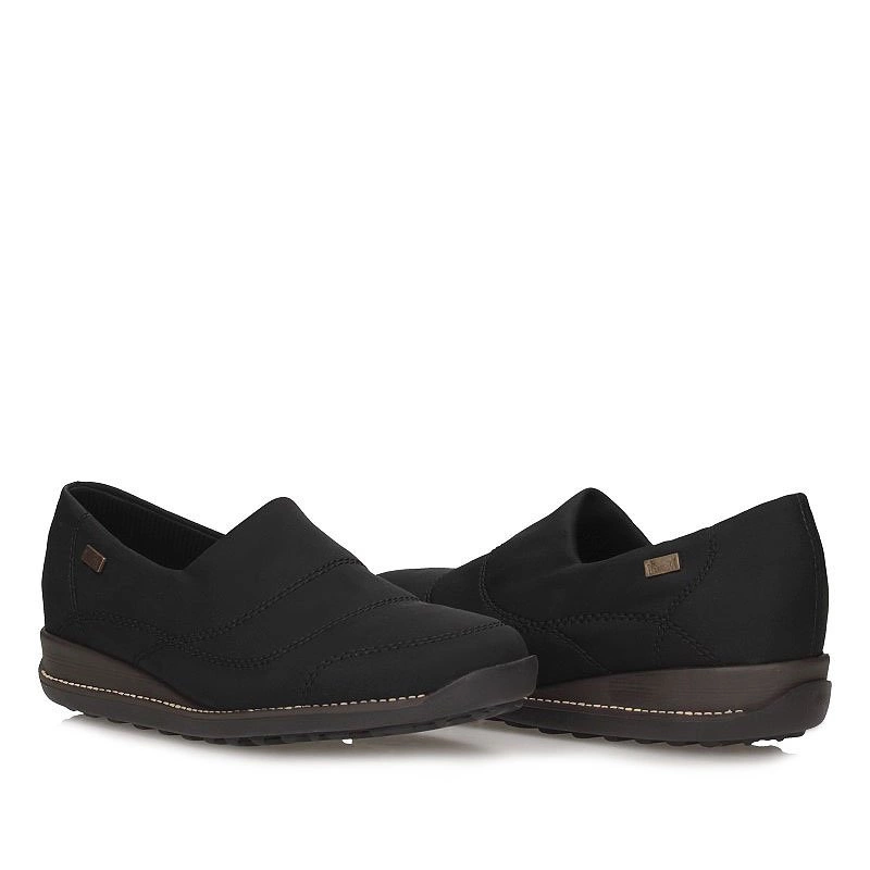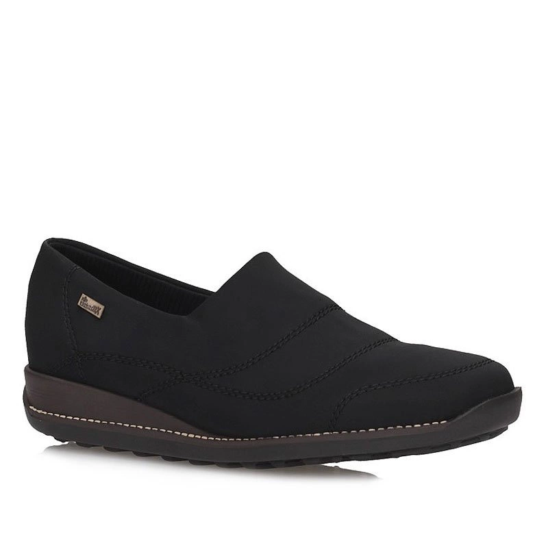 Oryginalne półbuty z nutka klasyki na zbliżający się sezon proponuje nam znana i ceniona niemiecka marka Rieker. Model został wykonany z wysokogatunkowego tworzywa sztucznego, elastycznego, dopasowującego się do tęgości stopy. Obuwie zostało dodatkowo wzbogacone w system Rieker Tex, dzięki któremu obuwie jest nieprzemakalne, lekkie i niesamowicie wygodne. Półbuty idealnie sprawdzą się dla stóp wrażliwych, z haluksami. Obuwie nie powoduje ucisku newralgicznych punktów stopy, a jednocześnie dopasowuje się do jej kształtu. Wnętrze półbuta zostało wyściełane miłą skórą naturalną oraz ekologiczną, która dba o prawidłowy komfort naszych stóp podczas całodniowego użytkowania. Obuwie wciągane, przez co szybko i sprawnie założymy oraz ściągniemy półbuty. Podeszwa podwyższana o wysokości 3,7 cm, stabilna, antypoślizgowa, odporna na ścieranie.