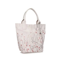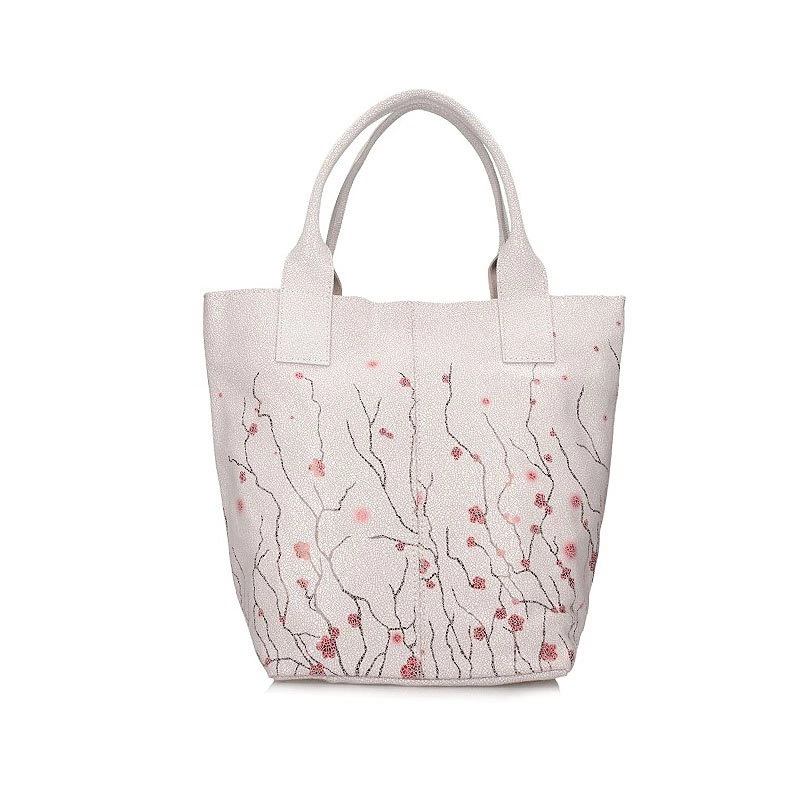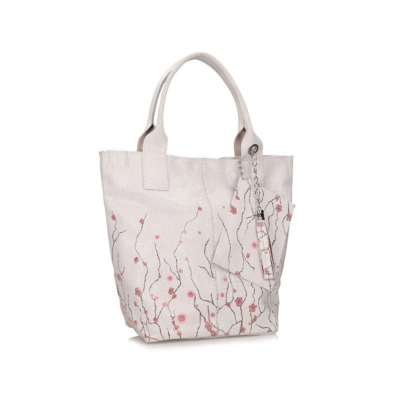 Torebka z motywem kwiatowym zaprojektowana przez włoskich projektantów marki Toscanio to hit tego sezonu. W produkcji tego modelu zastosowano delikatną i niezwykle miłą skórę naturalną. Pojemny fason shopper bag, zapinana na zamek. Torebka jednokomorowa, posiada wygodne uchwyty, dzięki czemu można nosić ją w dłoni. Do kompletu z torebką dodano saszetkę wykonaną w tym samym stylu, która może pełnić funkcję portfela lub kosmetyczki.