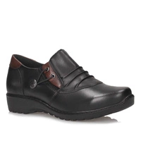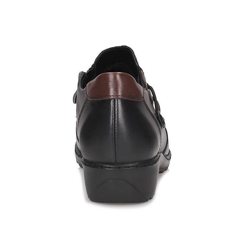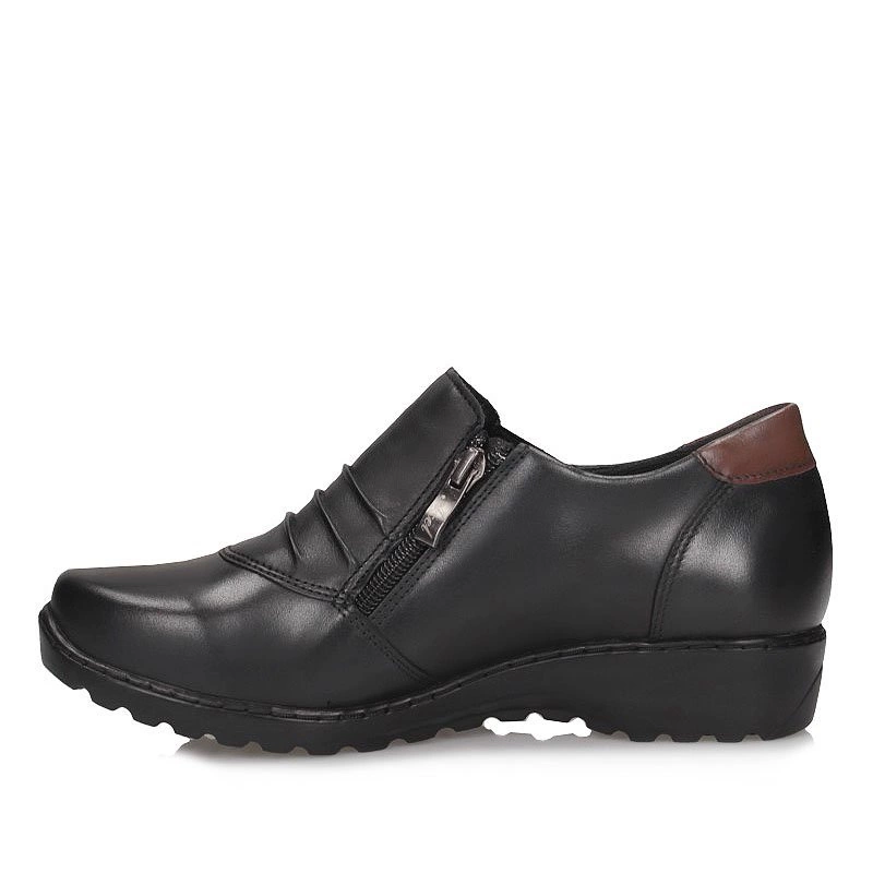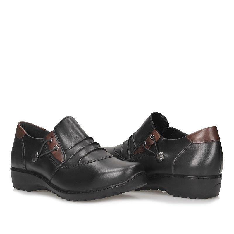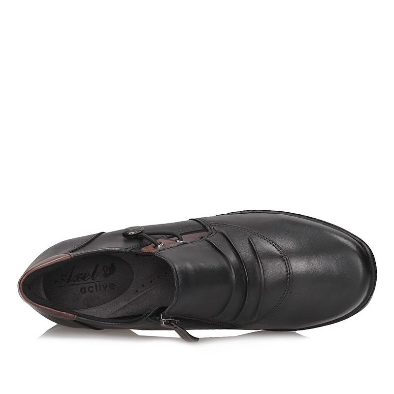 Producent renomowanej marki Axel prezentuje miękki model półbutów. Cholewkę tworzy wysokogatunkowa skóra naturalna licowa, w czarnym odcieniu z brązowymi wstawkami. Wewnątrz miękka wkładka wykonana z naturalnej skóry, co pozwala na większy komfort podczas dłuższego użytkowania. Elastyczne gumki na wsuwanej cholewce sprawiają, że buty doskonale dopasowują się do stopy a ich zakładanie nie sprawia nam żadnego problemu. Podeszwa płaska, odporna na ścieranie, z właściwościami antypoślizgowymi.