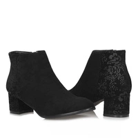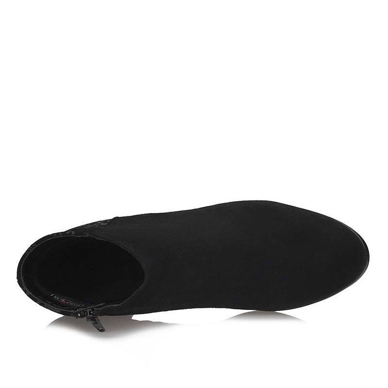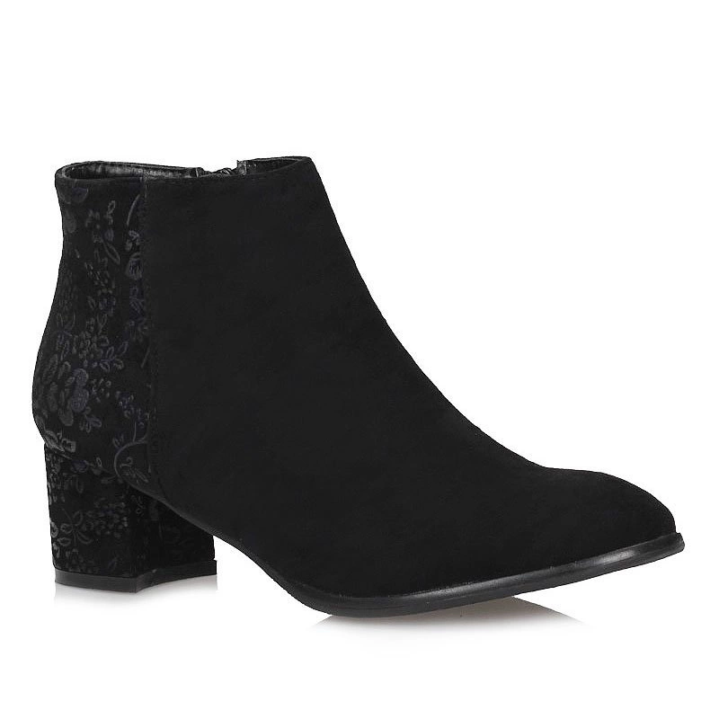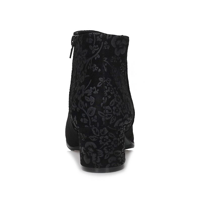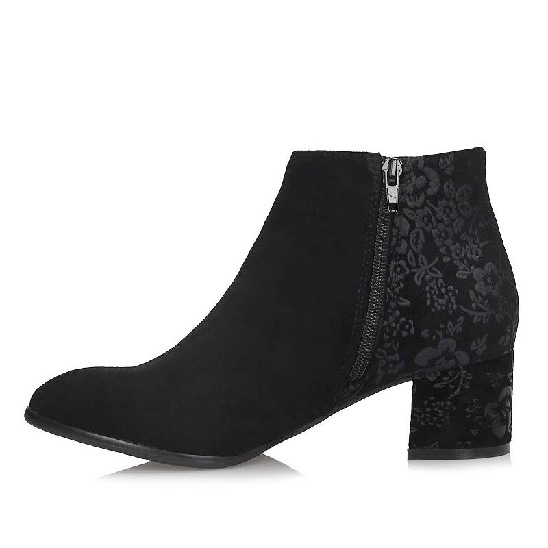 Znana marka Filippo przedstawia nam damskie botki z najnowszej kolekcji jesienno-zimowej. Botek został wykonany z wysokogatunkowej skóry ekologicznej zamszowej w klasycznym odcieniu czerni. Na tyle cholewki oraz na obcasie został zamieszczony motyw kwiatowy. Obuwie zapinane na szybki w użytkowaniu zamek. Antypoślizgowa i odporna na ścieranie podeszwa została wykonana z tworzywa sztucznego.