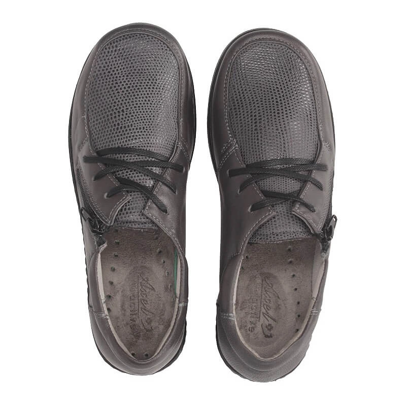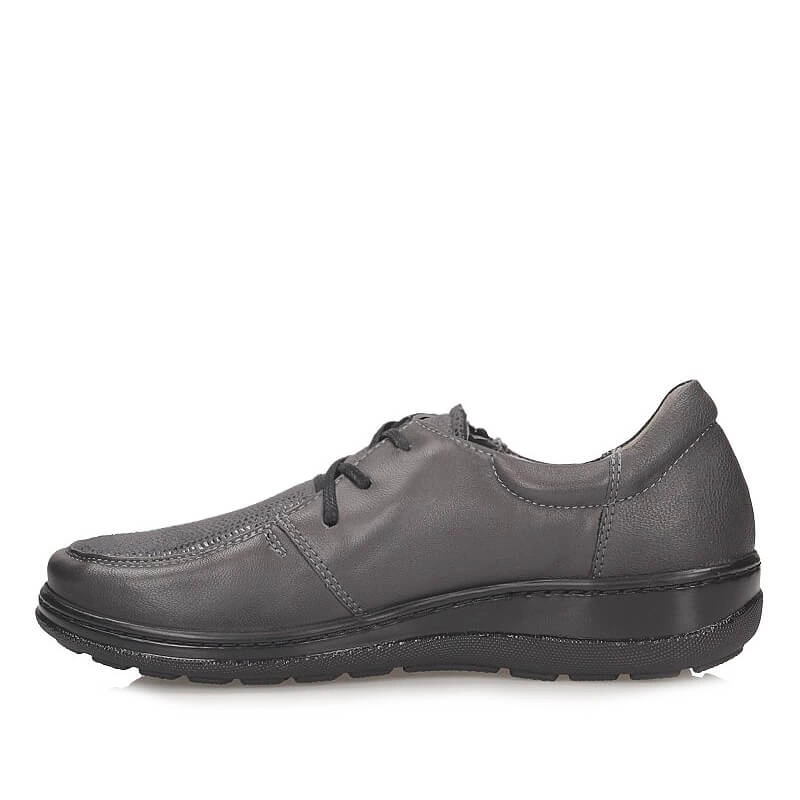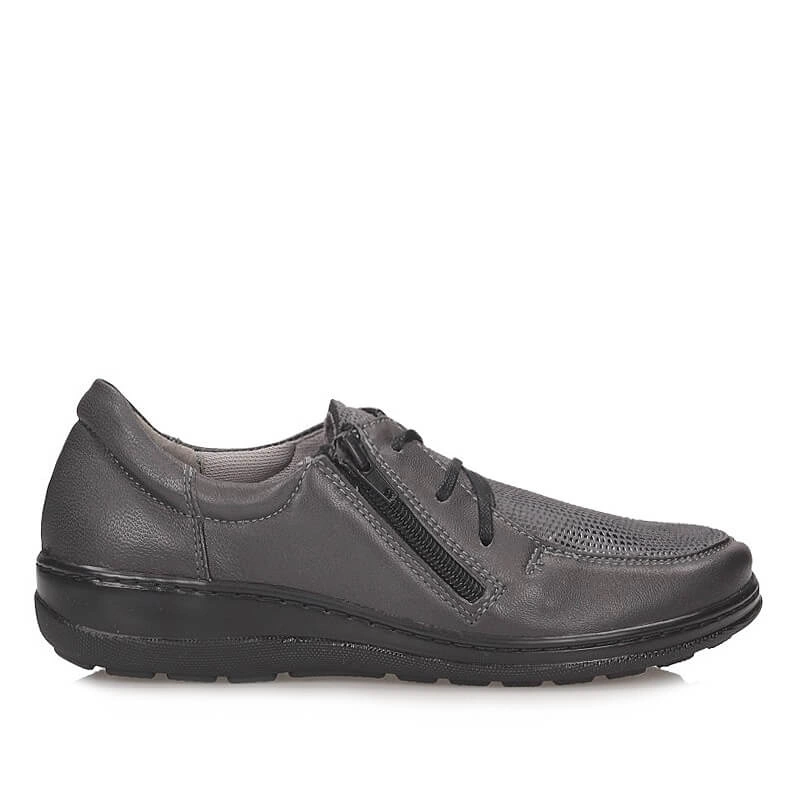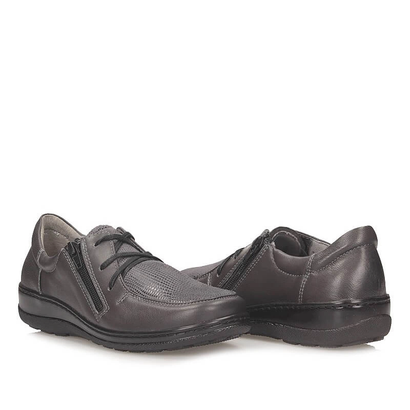 Rewelacyjne półbuty codzienne dla Pań ceniących komfort i relaks przedstawia polska marka Axel. Obuwie wykonane jest z naturalnej skóry licowej w szarym odcieniu. Wzbogacone wstawką z miękkiego materiału umożliwiającego dopasowanie do stopy. Atutem tego modelu jest specjalnie profilowana wkładka oraz elastyczna podeszwa o właściwościach antypoślizgowych. Zamek znajdujący się z boku pozwala na wygodne użytkowanie obuwia.