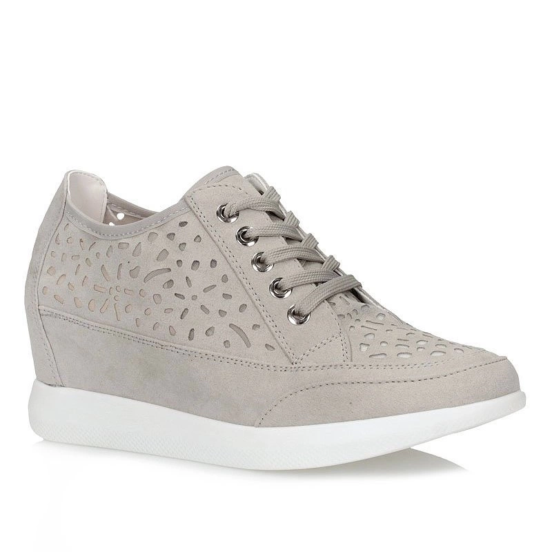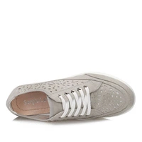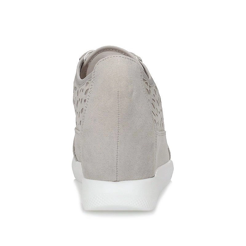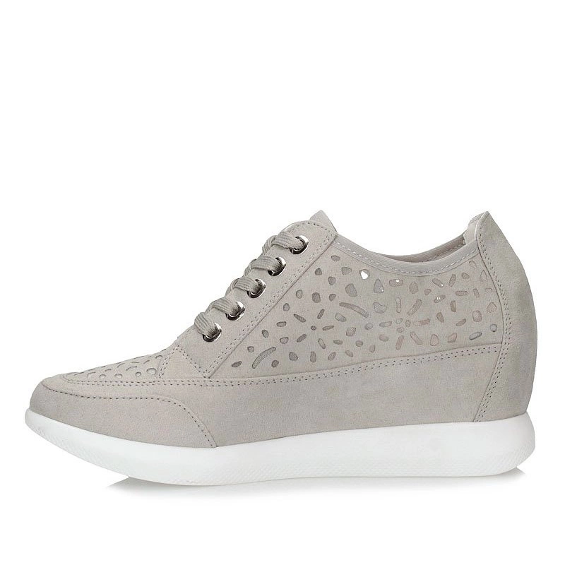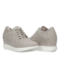 Na sezon wiosenno-letni firma Sergio Leone prezentuje lekkie i wygodne sneakersy. Przewiewną cholewkę wykonano ze skóry ekologicznej zamszowej w szarym kolorze. Wnętrze wyściełane przyjemną dla skóry tkaniną. Skórzana wkładka zapewnia odpowiedni mikroklimat dla stóp. Całość wsparta na 3,5-centymetrowym klinie, co zapewnia komfort użytkowania i stabilność kroku. Sznurowanie na pięć dziurek pozwala na idealne dopasowanie obuwia do tęgości stopy.