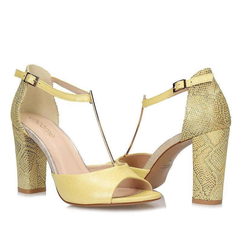 Sandały w odcieniu żółtym polskiej marki Uncome, skradną niejedno kobiece serce. Cholewkę wykonano ze skóry naturalnej licowej, delikatnej i miękkiej. Zapinane na złotą sprzączkę, znajdującą się na pasku, zapinanym wkoło kostki, który połączono złotym elementem z cholewką. Do stworzenia wewnętrznej wyściółki użyto skóry naturalnej, która nie podrażni naszej skóry i sprawi, że sandałki świetnie dopasują się do naszych stóp. Tył sandałków ozdobiono złotym motywem, który przyciąga nasz wzrok. Obcas o wysokości 9,5 cm zapewni nam stabilność oraz doda nam kobiecego wdzięku. Podeszwę wykonano z trwałego tworzywa z właściwościami antypoślizgowymi. Model idealny dla Pań ceniących sobie oryginalność. Świetnie sprawdzą się w nadchodzącym sezonie letnim.