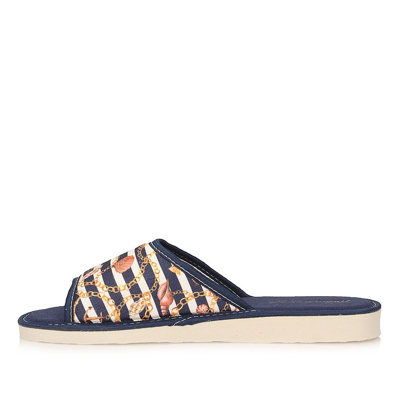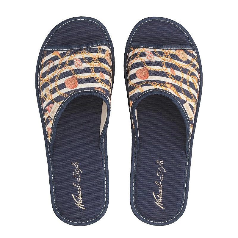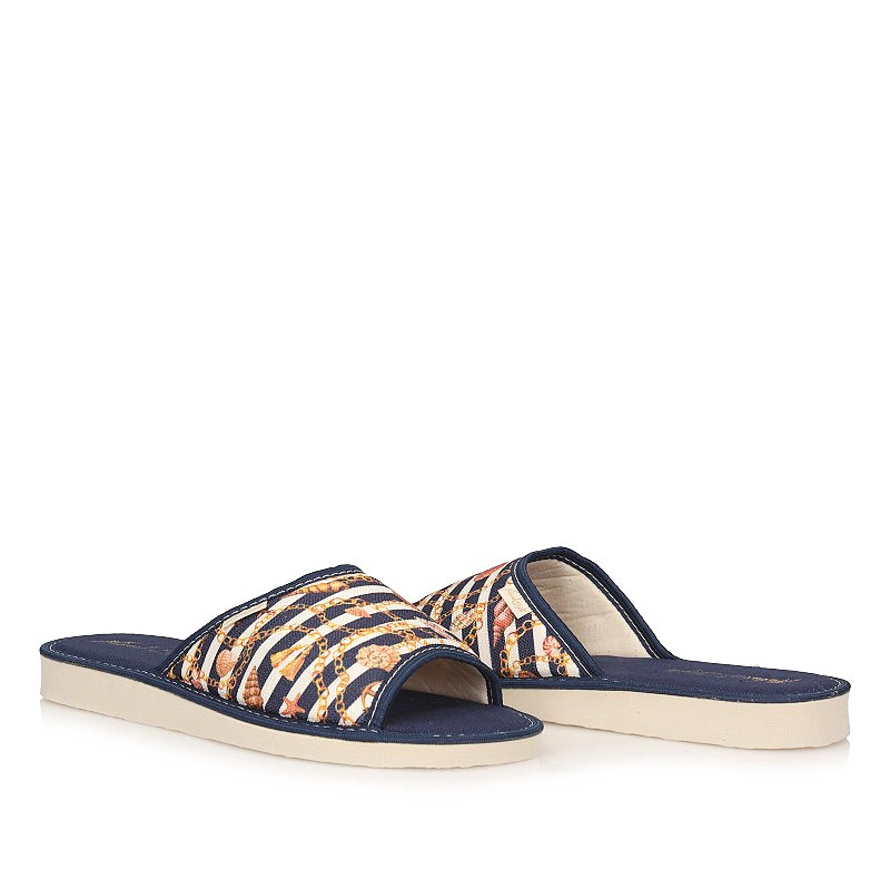 Popularna polska marka Meteor prezentuje nam damskie laczki domowe z najnowszej kolekcji. Wierzch został wykonany z wysokiej jakości tkaniny w odcieniu granatowym. Wnętrze zostało wykonane z delikatnej dla stóp tkaniny. Nosek zaokrąglony, odkryty, uniesiony lekko ku górze. Trwała, odporna na ścieranie podeszwa wykonana została z wysokogatunkowego tworzywa sztucznego z właściwościami antypoślizgowymi.