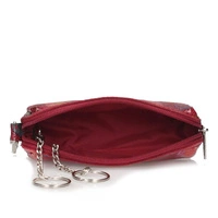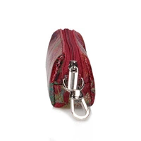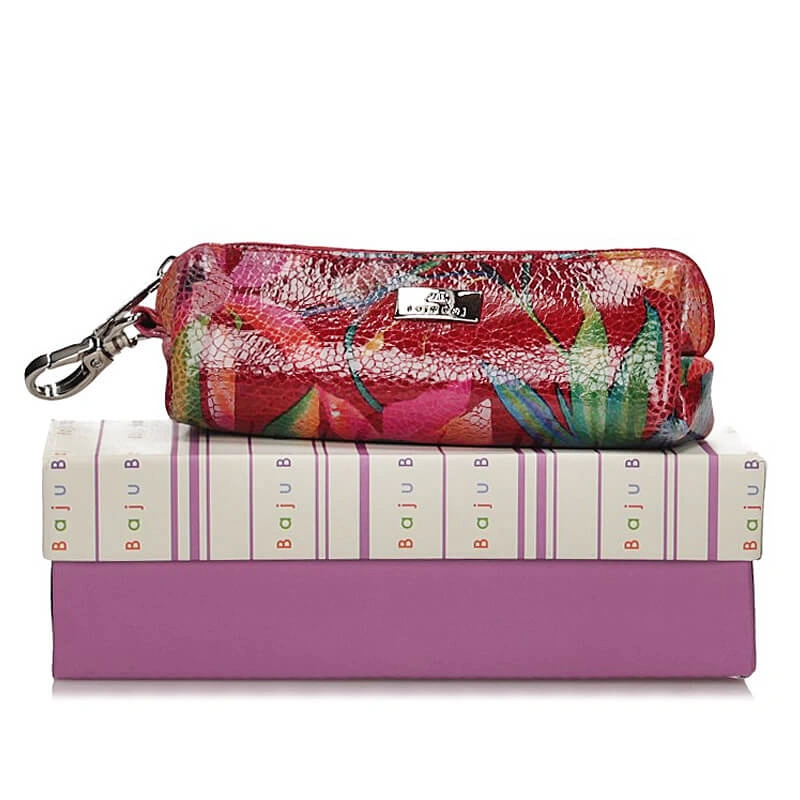 Etui na klucze w kolorze czerwonym z kwiatowym wzorem od marki Baju Baj. Model ten wykonano z wysokiej jakości skóry naturalnej. Zapinane na zamek. Wewnątrz posiada dwa kółeczka z łańcuszkami do przypięcia kluczy. Zewnętrzny karabińczyk umożliwia dopięcie etui w dowolnym dla nas miejscu. Wewnątrz etui wyściełane tkaniną.