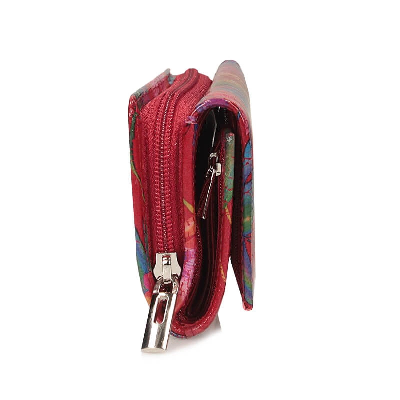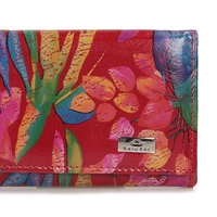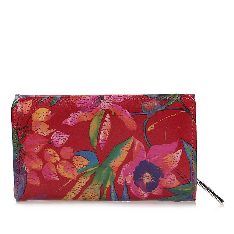 Stylowy i oryginalny portfel marki Baju Baj prezentuję się prześlicznie. Powyższy model w kolorze czerwonym z modną aplikacją kolorowych kwiatów został wykonany z bardzo miękkiej i przyjemnej w dotyku skóry naturalnej. Portfel ma jedną komorę zapinaną na zatrzask, a drugą z przeznaczeniem na bilon na zamek. W kolorze zapinanej a zatrzask znajdują się: 7 miejsc na karty lub wizytówki, miejsce na zdjęcie, trzy przegrody na dokumenty np: dowód rejestracyjny, trzy większe przegrody na banknoty w tym jedna zapinana na zamek. Portfel idealny do ręki, na przodzie posiada logo marki w kolorze srebrnym.