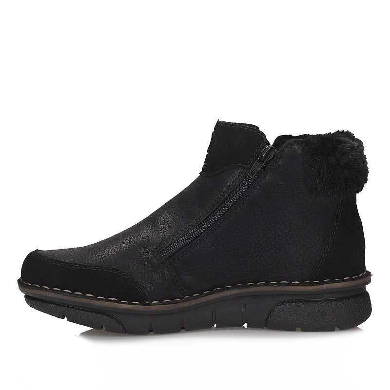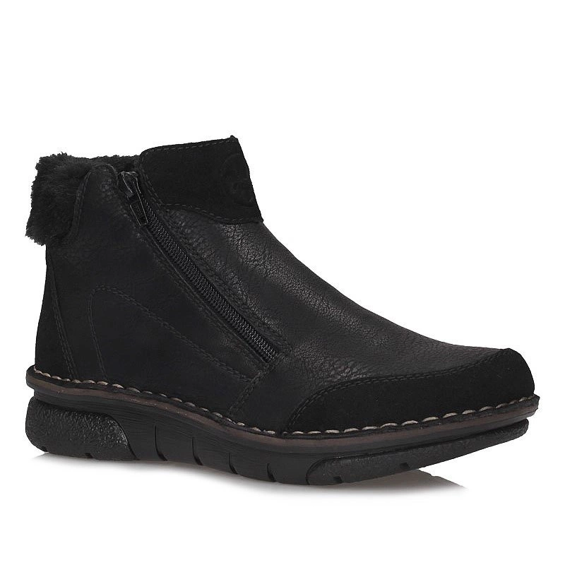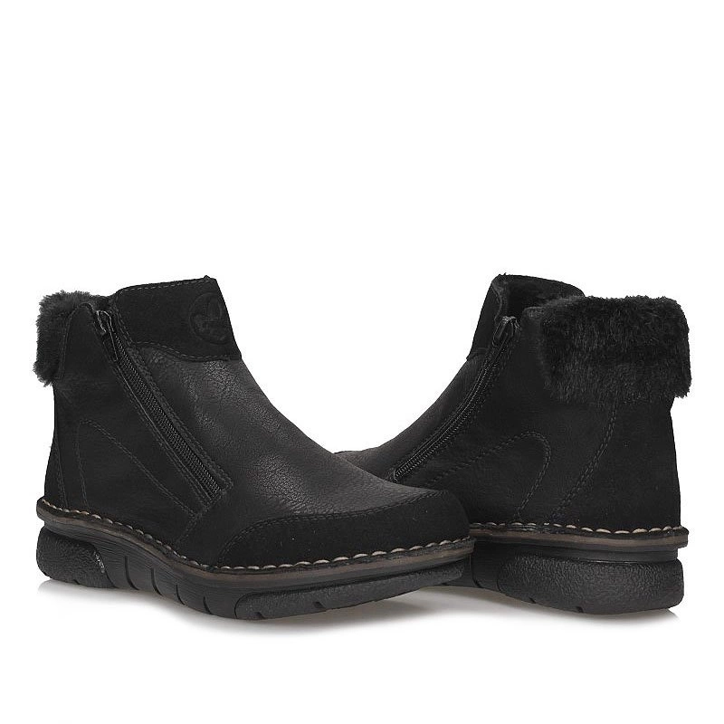 Niemiecka marka Rieker prezentuję fantastyczne botki z najnowszej kolekcji jesiennej. Prezentowany model obuwia w kolorze czarnym został wykonany z najwyższej jakości, bardzo miękkiej i przyjaznej w dotyku skóry ekologicznej. Obuwie zapinane na dwa zamki, przez co szybko i bezproblemowo ubierzemy je oraz ściągniemy. Cholewka elastyczna, z łatwością dopasujemy odpowiednią tęgość obuwia do stopy. Botki prezentują się bardzo zgrabnie i stylowo. Całe wnętrze zostało wyłożone ociepliną naturalną, która otuli nasze stopy podczas chłodniejszych dni. Podeszwa trwała, ciemna, odporna na ścieranie, antypoślizgowa.