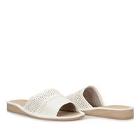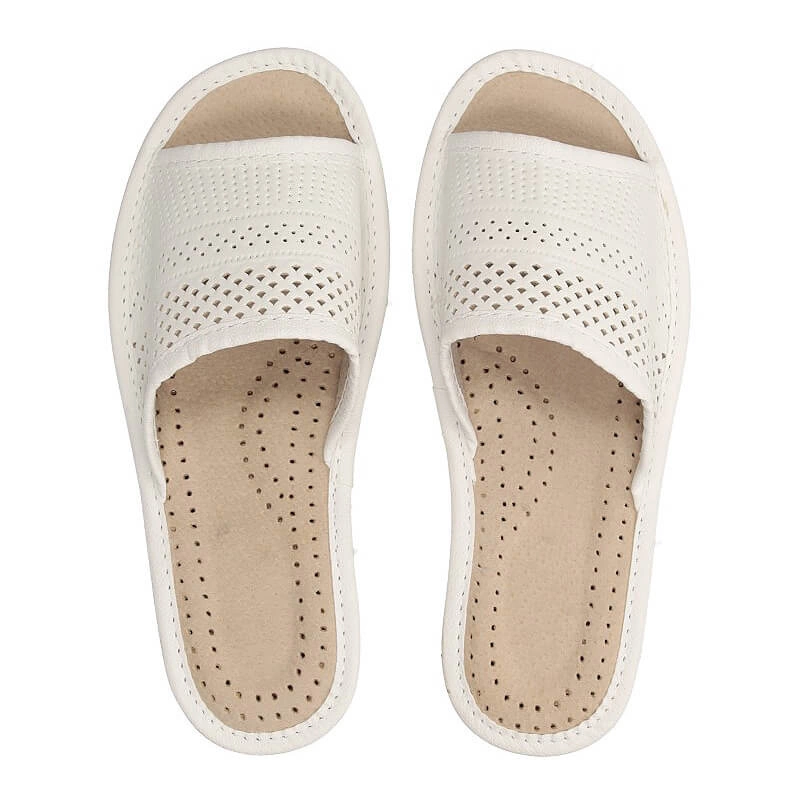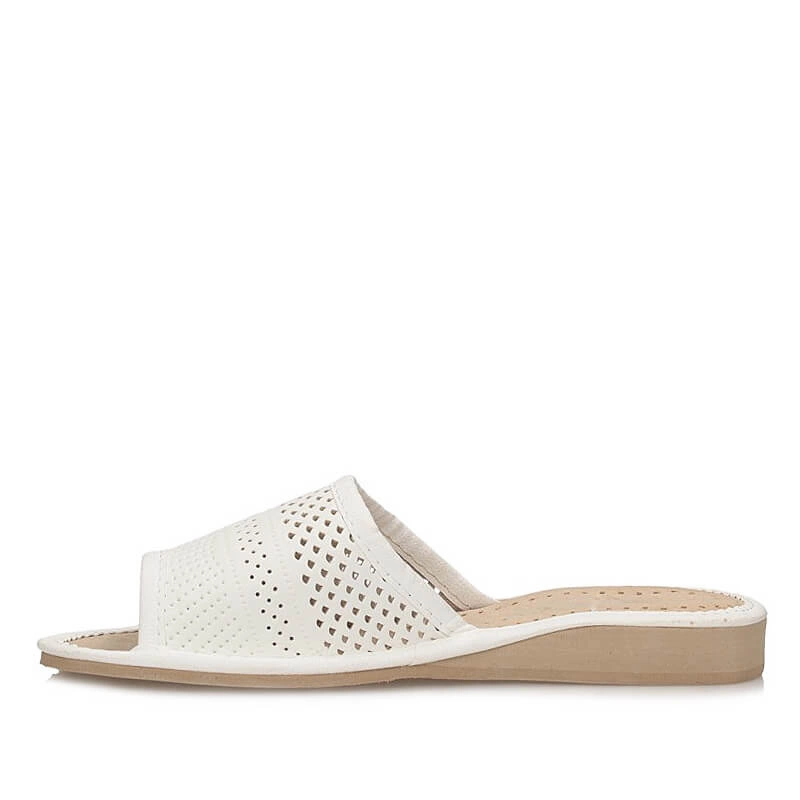 Popularna marka Nowo przygotowała dla nas damskie domowe laczki z najnowszej kolekcji wiosenno-letniej. Cholewka została wykonana z wysokiej jakości skóry naturalnej licowej w odcieniu ślicznej bieli. Wyściółka oraz wkładka zostały wyściełane z miękkiej oraz delikatnej dla stóp skóry naturalnej. Model posiada zaokrąglony odkryty nosek, co umożliwia nam na swobodne rozłożenie palców. Trwała oraz odporna na ścieranie podeszwa wykonana została z wysokogatunkowego tworzywa sztucznego z właściwościami antypoślizgowymi. Sprawdź także inne obuwie domowe.
