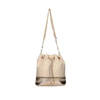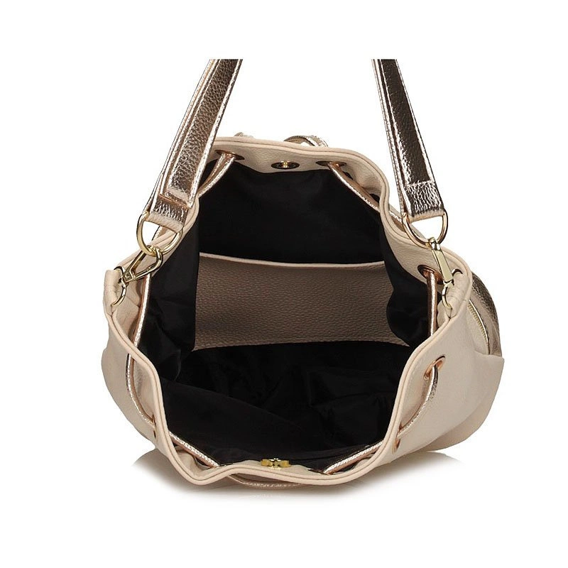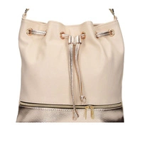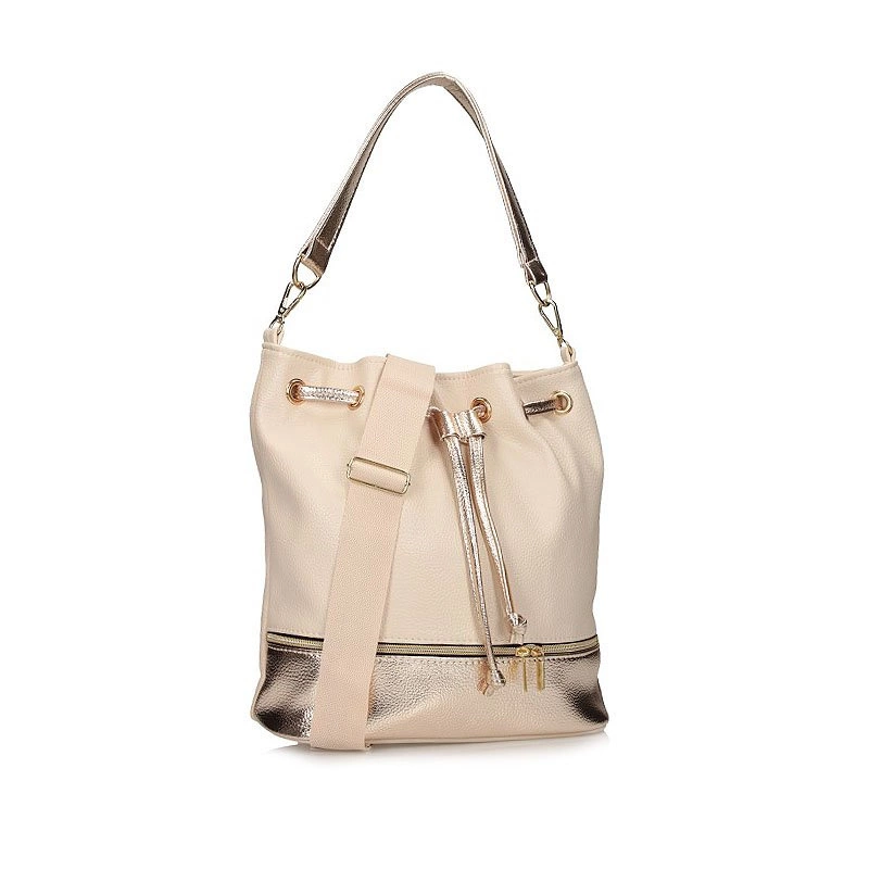Bardzo ceniona marka VIVI przedstawia nam torebkę typu worek z najnowszej kolekcji wiosenno-letniej. Model został wykonany z wysokiej jakości skóry ekologicznej w odcieniu beżu z dodatkiem złotego. Worek jednokomorowy posiada ściągacz, ale również zapina się na magnes. Wewnątrz znajdziemy kieszonkę na telefon oraz kieszonkę zapinająca się na zamek. Z tyłu jak i z przodu znajdziemy kieszonki zapinające się na zamek. Przy torebkę znajdziemy rączkę, umożliwi ona nam noszenie worka w dłoni. Producent również dołączył długi, regulowany pasek, który pozwoli nam na noszenie na ramieniu oraz przez ramię.