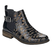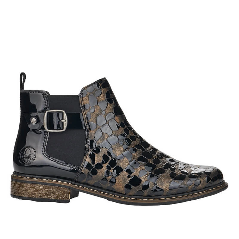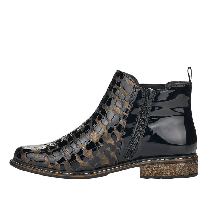 Niemiecka marka Rieker przedstawia nam botki z najnowszej kolekcji jesienno-zimowej. Model został wykonany z wysokiej jakości skóry ekologicznej lakierowanej w odcieniu klasycznej czerni. Nosek zaokrąglony, lekko podniesiony ku górze. Wyściółka została wykonana z ciepłej ociepliny przyjemnej dla stóp. Model zapinany na zamek błyskawiczny pozwala na szybkie zakładanie. Podeszwa wykonana z wysokogatunkowego tworzywa sztucznego z właściwościami antypoślizgowymi.