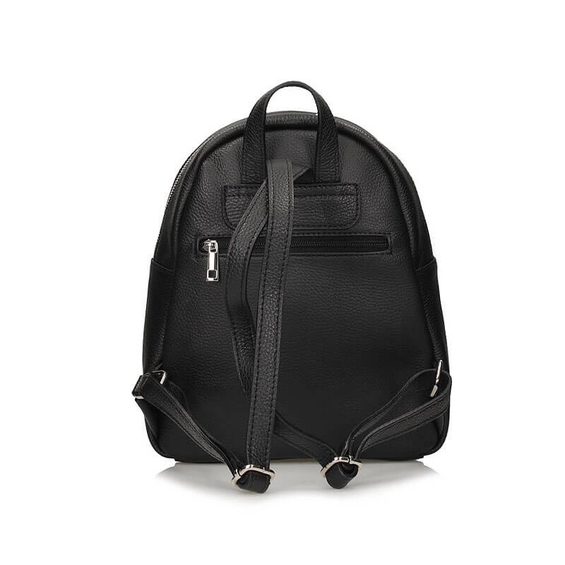 Znana oraz lubiana włoska marka Toscanio przedstawia nam plecak z najnowszej kolekcji. Model w kolorze klasycznej czerni wykonany został z wysokiej jakości skóry naturalnej. Fason jednokomorowy zapinany na błyskawiczny zamek. Z tyłu oraz z przodu znajdują się kieszonki zapinane na błyskawiczny zamek, które idealnie sprawdzą się na kobiece drobiazgi. Plecak jest bardzo pojemny, dzięki temu sprawdzi nam się na różnego rodzaju wyjścia. Regulowane ramiączka umożliwią nam noszenie plecaka tak jak nam wygodnie. Na przodzie wytłoczono logo marki.