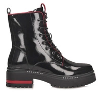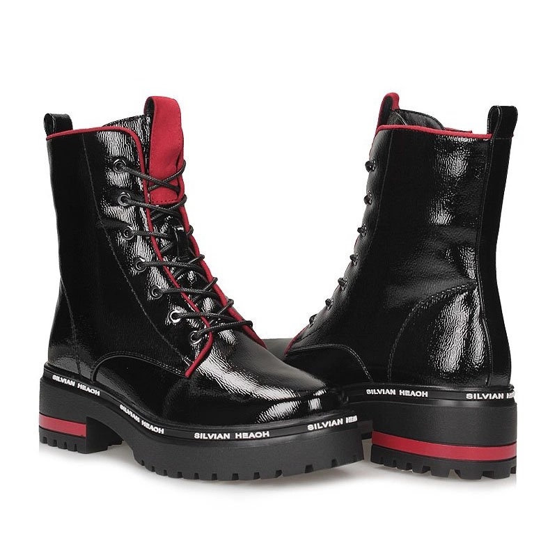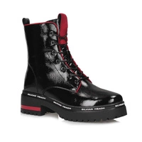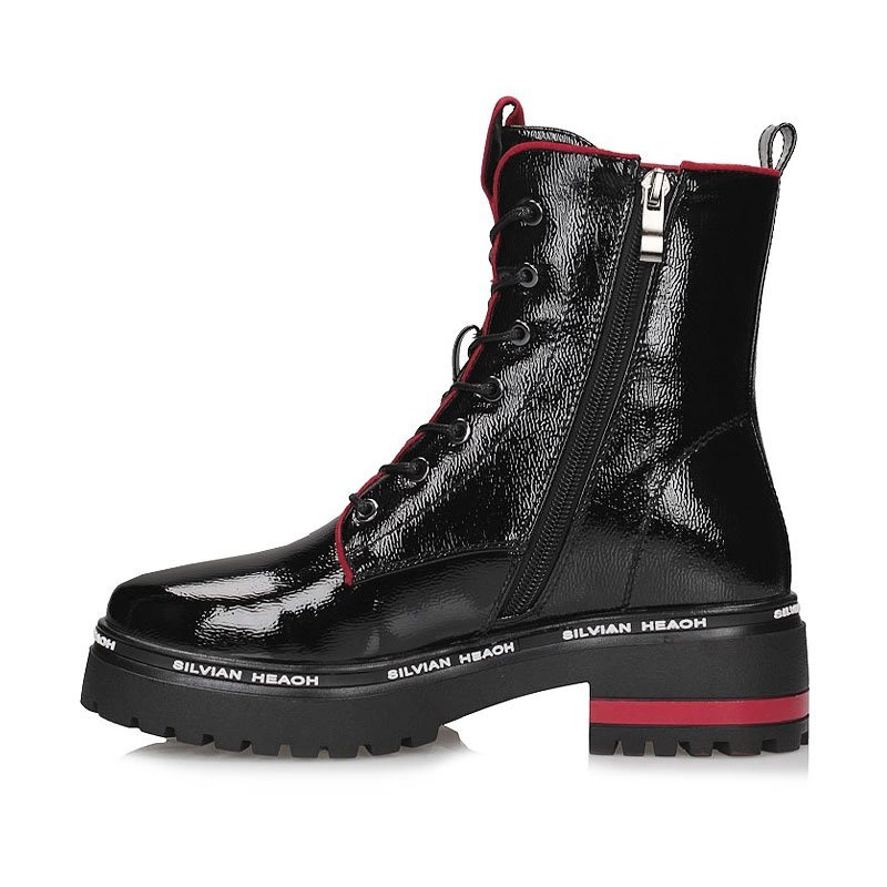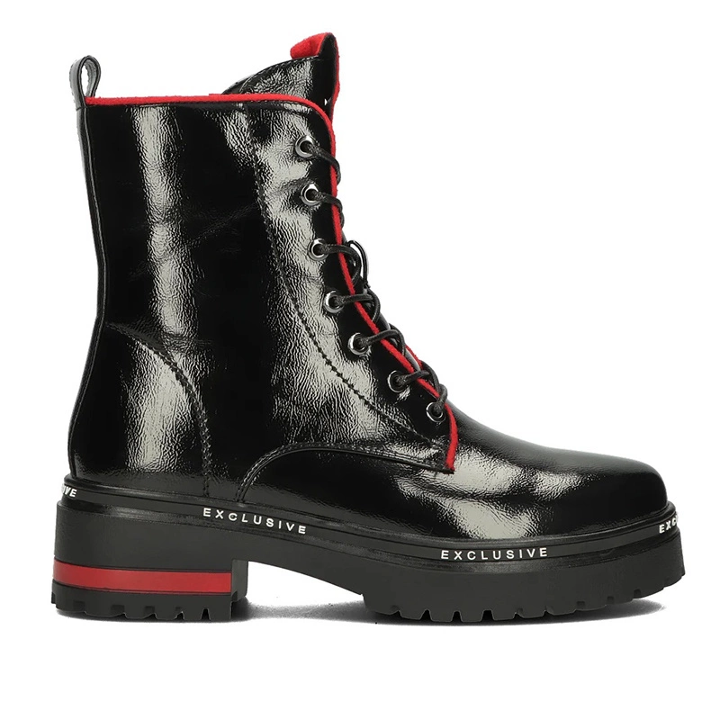 Oryginalne i ciekawe botki przedstawia marka Filippo. Cholewka obuwia wykonana została z wysokogatunkowej skóry ekologicznej lakierowanej. Obuwie zostało wyposażone w sznurowanie na 7 dziurek oraz w zamek błyskawiczny znajdujący się po wewnętrznej stronie obuwia. Miękkie i delikatne wnętrze obuwia tworzy ocieplina, która zapewnić ma stopom ciepło oraz wygodę. Nosek obuwia zaokrąglono i lekko podniesiono ku górze. Botki swoją oryginalność zawdzięczają czerwonym elementom ich wykończenia oraz napisom umieszczanym w podeszwie obuwia. Botki osadzono na obcasie o wysokości 4,5 cm. Podeszwa wykonana została z trwałego tworzywa sztucznego.
