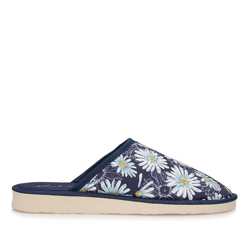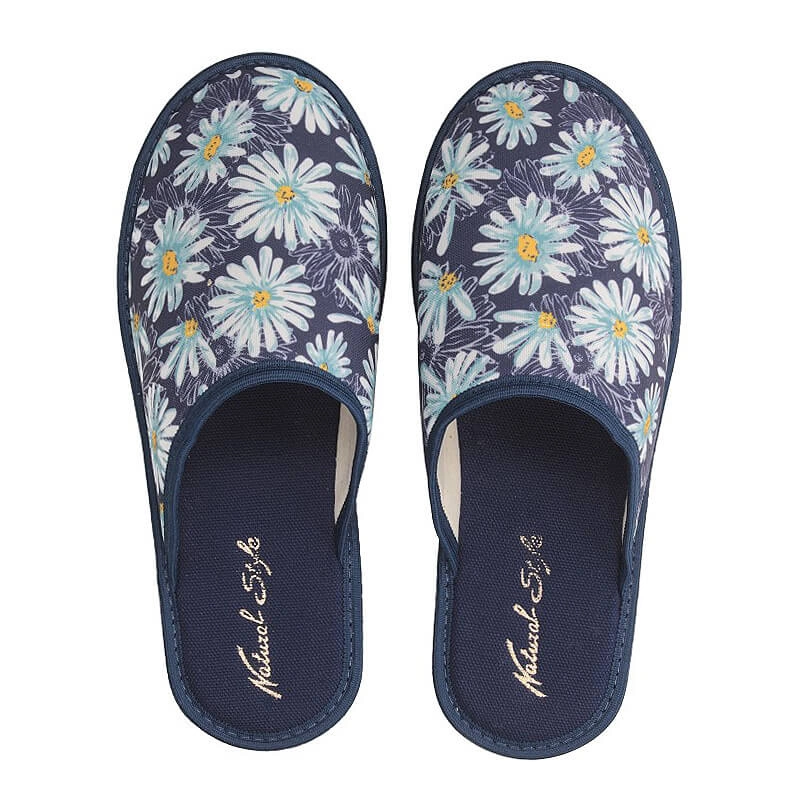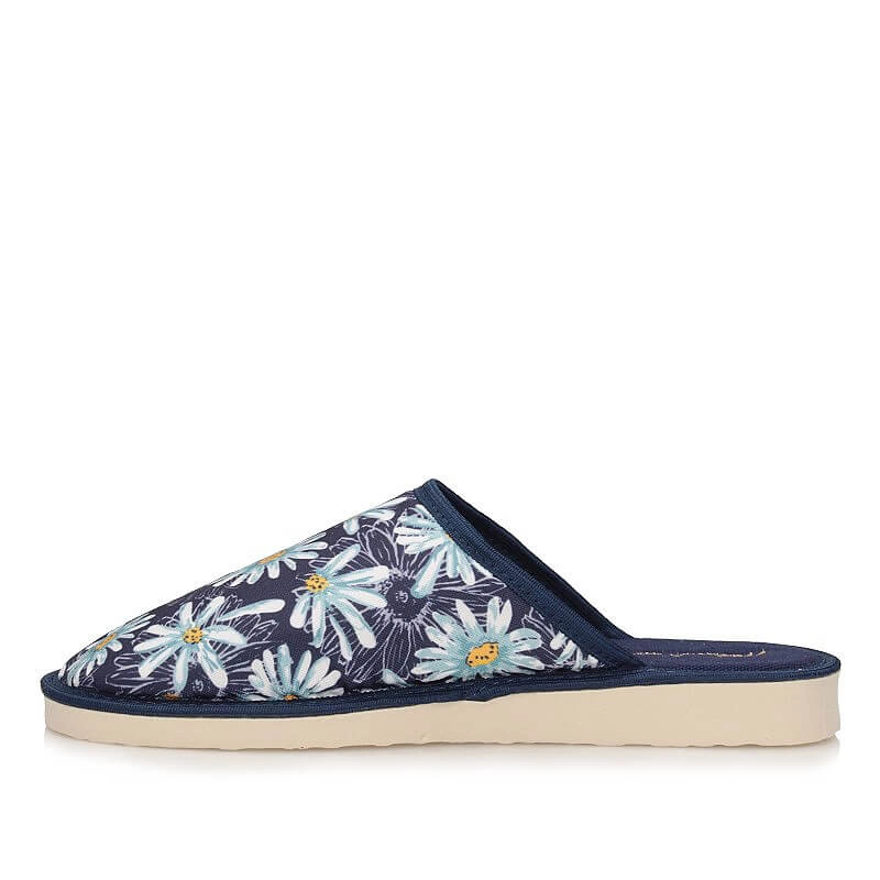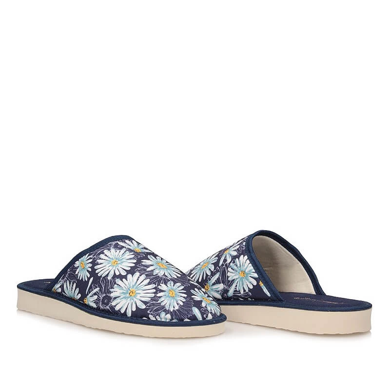 Lubiana marka meteor przedstawia nam laczki domowe z najnowszej kolekcji. Model w kolorze granatowym wykonany został z wysokiej jakości materiału tekstylnego. Wkładka delikatna dla stóp wykonana została z tkaniny. Nosek zaokrąglony, lekko uniesiony ku górze dzięki czemu swobodnie możemy rozłożyć palce. Cholewka przyozdobiona została kolorowymi kwiatkami. Podeszwa trwała z właściwościami antypoślizgowymi.