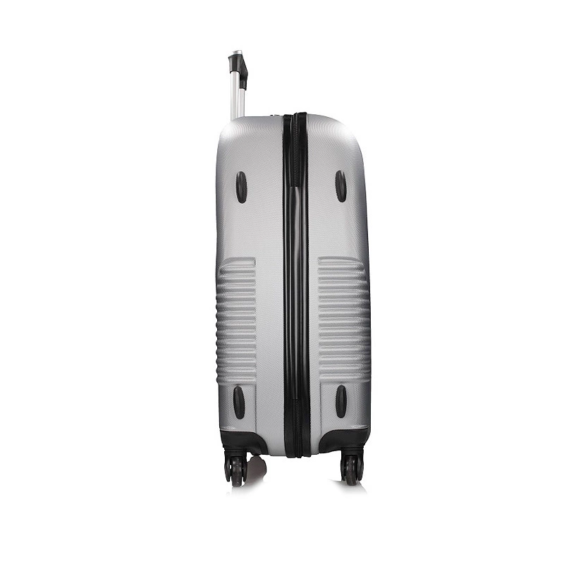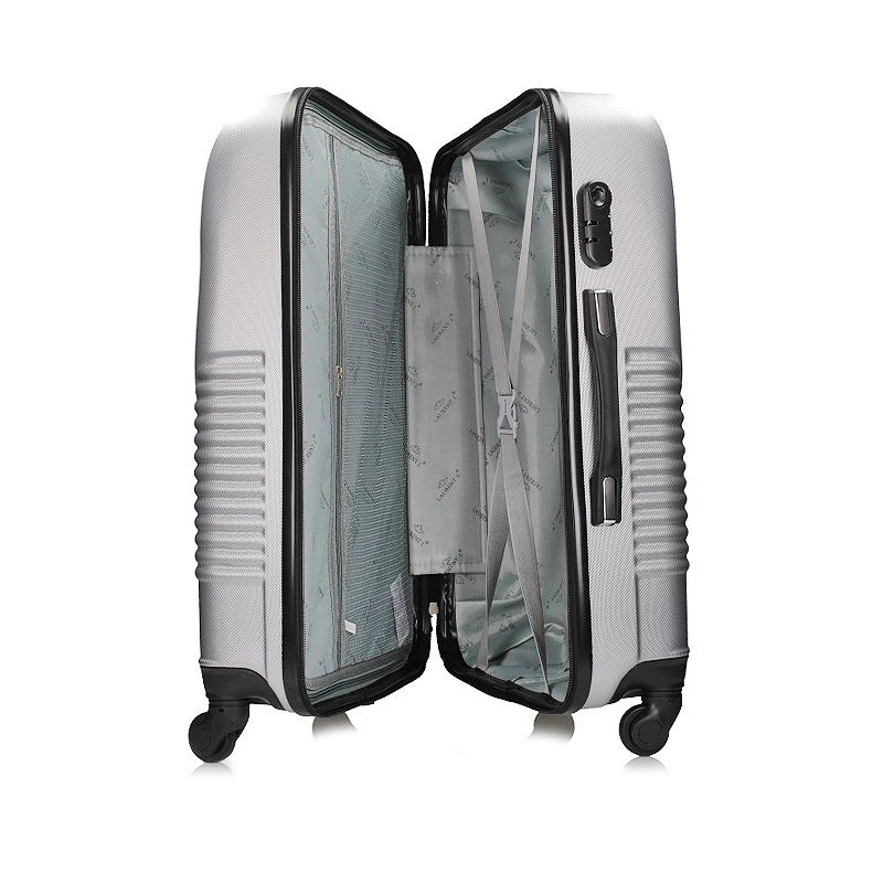 Walizka-kabinówka Laurent w srebrnym odcieniu. Wykonana z trwałego jak i lekkiego materiału ABS. Zapinana na trwały wygodny w użytkowaniu zamek. Wnętrze wyłożone delikatnym materiałem. Zamek umieszczony wewnątrz walizki pozwala na oddzielenie rzeczy od górnej części walizki, dodatkowo posiada pasy zapinane na klamrę, umożliwiające ich zabezpieczenie podczas podróży. Model ten wyposażono w zamek na szyfr umożlwiający zablokowanie suwaków. Wygodne dwie rączki, pozwalając na szybkie i komfortowe podróżowanie i przemieszczanie się z walizką. Posiada dodatkowe udogodnienie w postaci aluminiowego stelaża. Wygodne cztery kółka obracają się o 360 stopni.