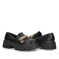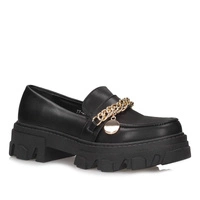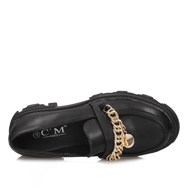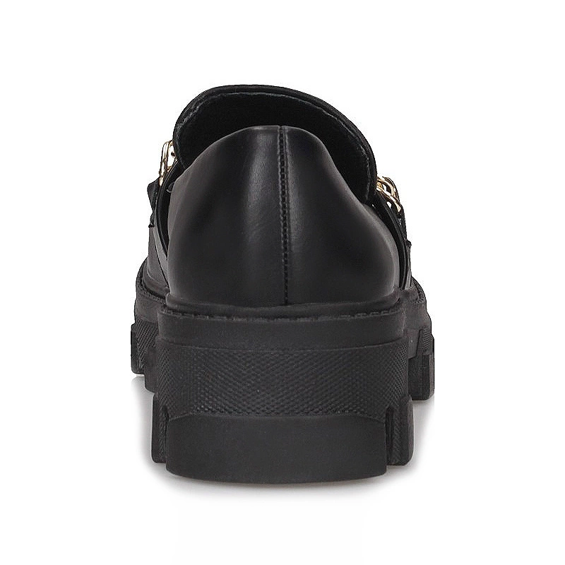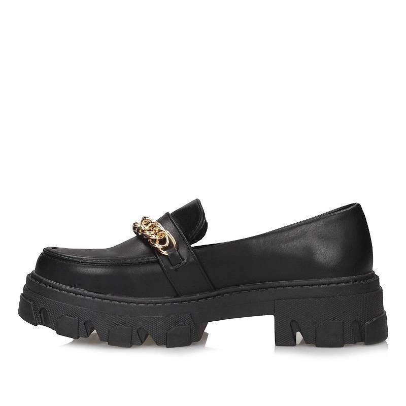 Znana oraz lubiana marka Vices przedstawia nam półbuty damskie z najnowszej kolekcji. Model w kolorze czarnym wykonany został z wysokogatunkowego tworzywa sztucznego. Delikatna dla stóp wkładka wykonana została z materiału tekstylnego. Nosek zaokrąglony, lekko uniesiony ku górze, dzięki czemu można swobodnie rozłożyć palce. Na cholewce umieszczony został ozdobny łańcuch w kolorze złotym, dzięki czemu obuwie wygląda bardzo oryginalnie. Podeszwa trwała, z właściwościami antypoślizgowymi.
