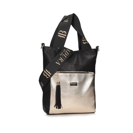 Lubiana marka Badura przedstawia nam torebkę damską z najnowszej kolekcji jesienno-zimowej. Model został wykonany z najwyższej jakości skóry ekologicznej w odcieniu złotym i czarnym. Jednokomorowa, zapinana na wygodny w użytkowaniu zamek. Wewnątrz mała kieszonka zapinana na zamek i kieszonka na drobiazgi. Z przodu jak i z tyłu małe kieszonki zapinane na zamek na kobiece drobiazgi. Producent dołączył długi, regulowany, doczepiany pasek. Dwa ramiona umożliwią noszenie torebki w ręku. Ozdobny frędzel i napisy dodają wyjątkowego wyglądu.