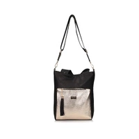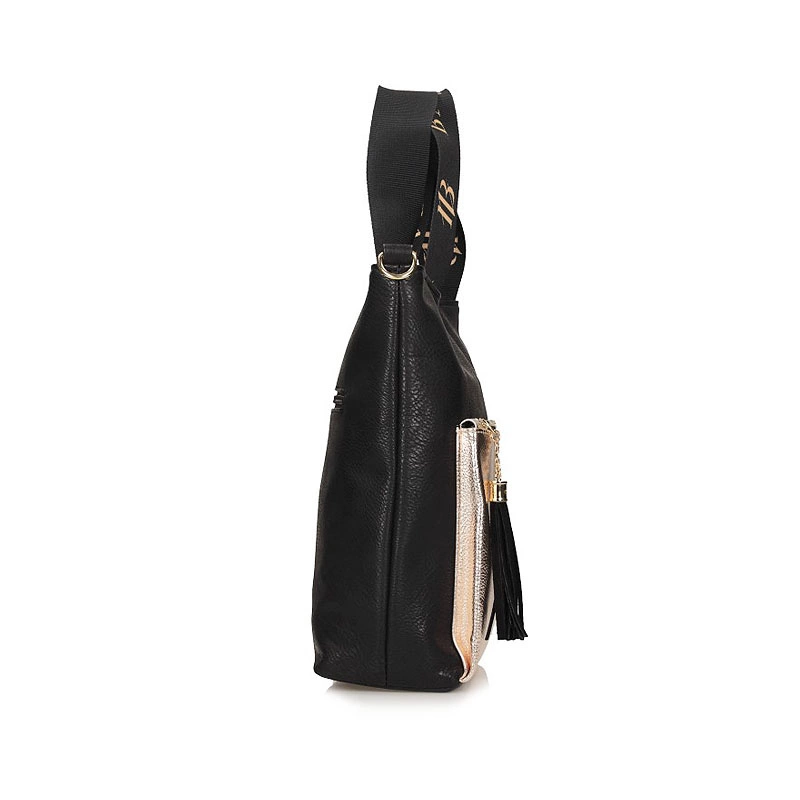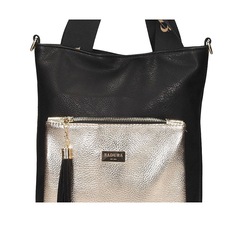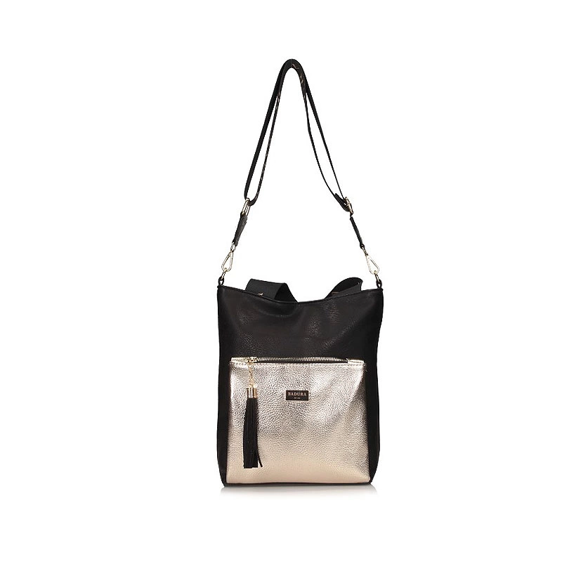 Lubiana marka Badura przedstawia nam torebkę damską z najnowszej kolekcji jesienno-zimowej. Model został wykonany z najwyższej jakości skóry ekologicznej w odcieniu złotym i czarnym. Jednokomorowa, zapinana na wygodny w użytkowaniu zamek. Wewnątrz mała kieszonka zapinana na zamek i kieszonka na drobiazgi. Z przodu jak i z tyłu małe kieszonki zapinane na zamek na kobiece drobiazgi. Producent dołączył długi, regulowany, doczepiany pasek. Dwa ramiona umożliwią noszenie torebki w ręku. Ozdobny frędzel i napisy dodają wyjątkowego wyglądu.
