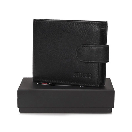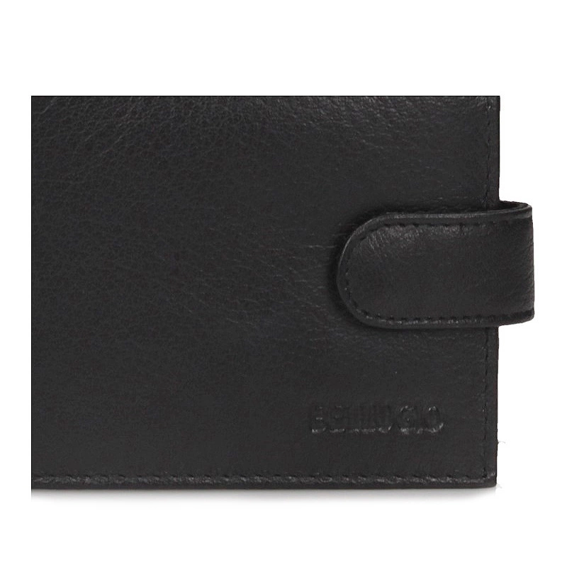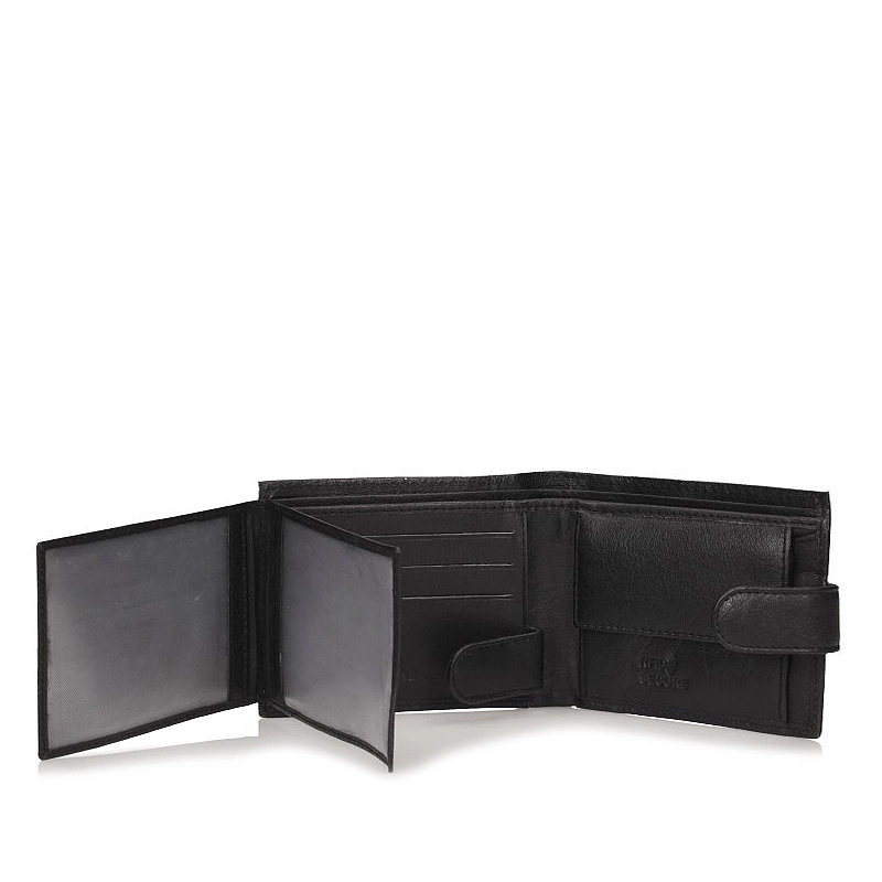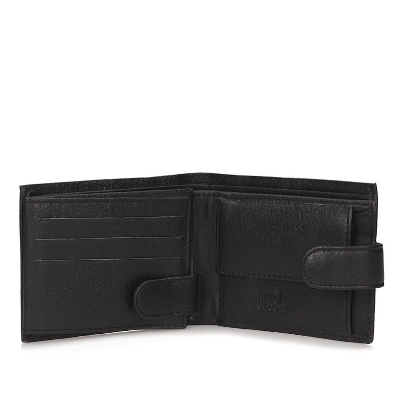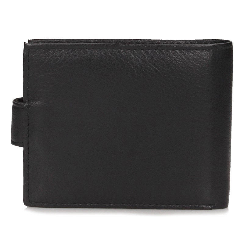 Portfel wykonany z naturalnej skóry w klasycznym czarnym kolorze — dyskretny dodatek, który łączy trwałość z praktycznym układem wnętrza.