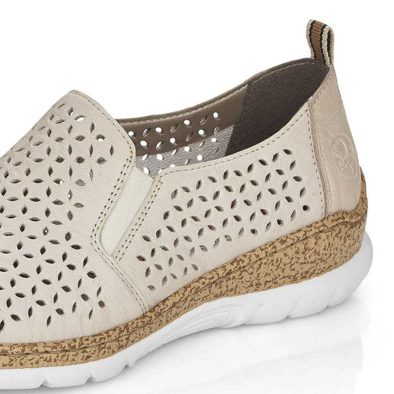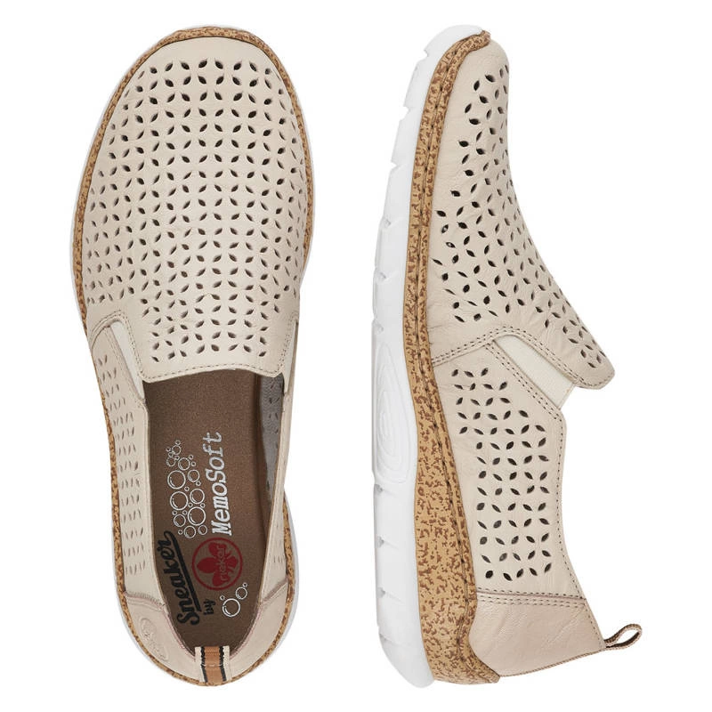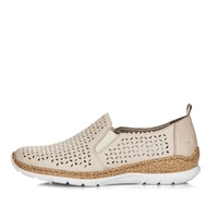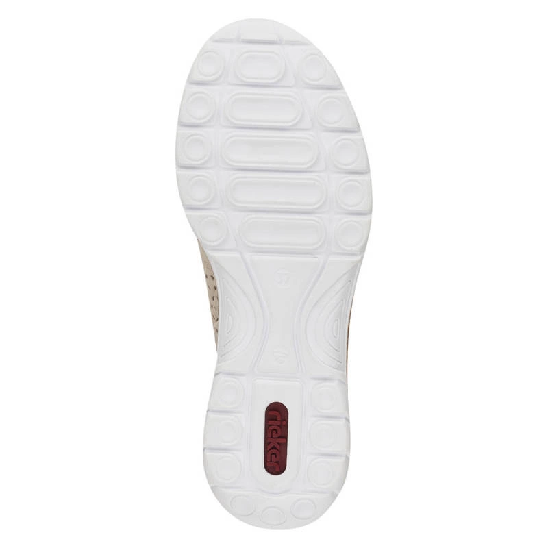 Znana oraz lubiana Niemiecka marka Rieker przedstawia nam półbuty z najnowszej kolekcji. Model w odcieniu beżowym wykonany został z wysokiej jakości skóry naturalnej licowej. Delikatna dla stóp wkładka wykonana została z materiału tekstylnego. Nosek zaokrąglony, lekko uniesiony ku górze dzięki czemu możemy swobodnie rozłożyć palce. Obuwie wsuwane dzięki czemu sprawnie je ściągniemy oraz założymy. Podeszwa trwała, odporna na ścieranie. Produkt podpięty pod promocję, ponieważ posiada zżółkniętą podeszwę.
