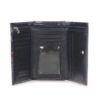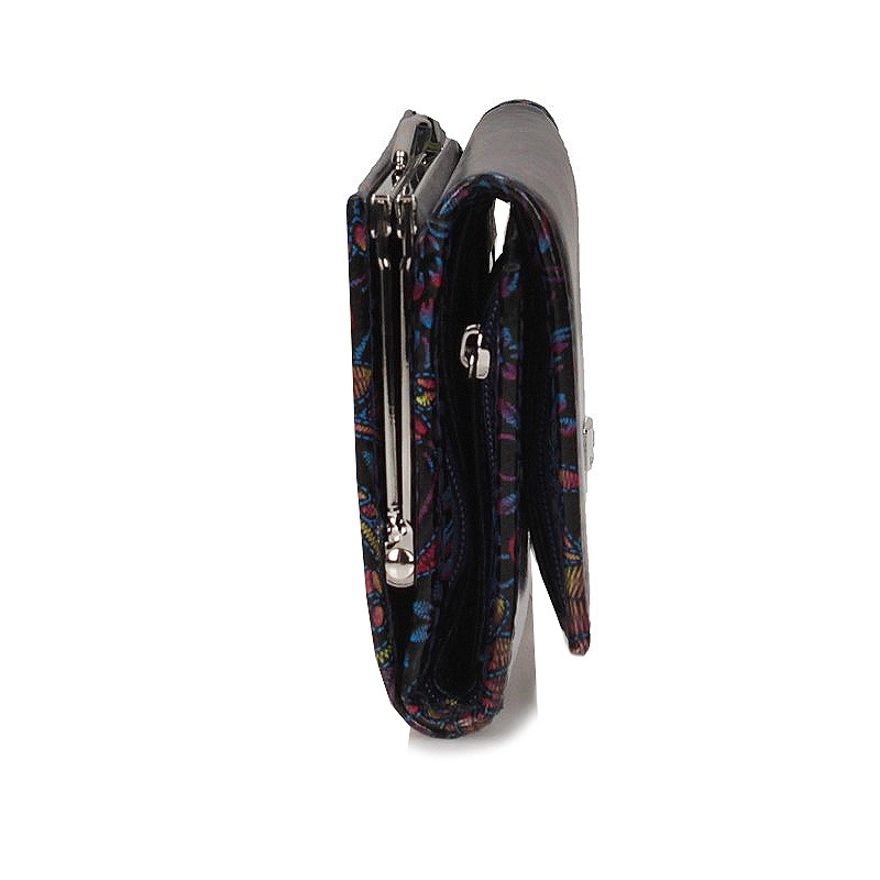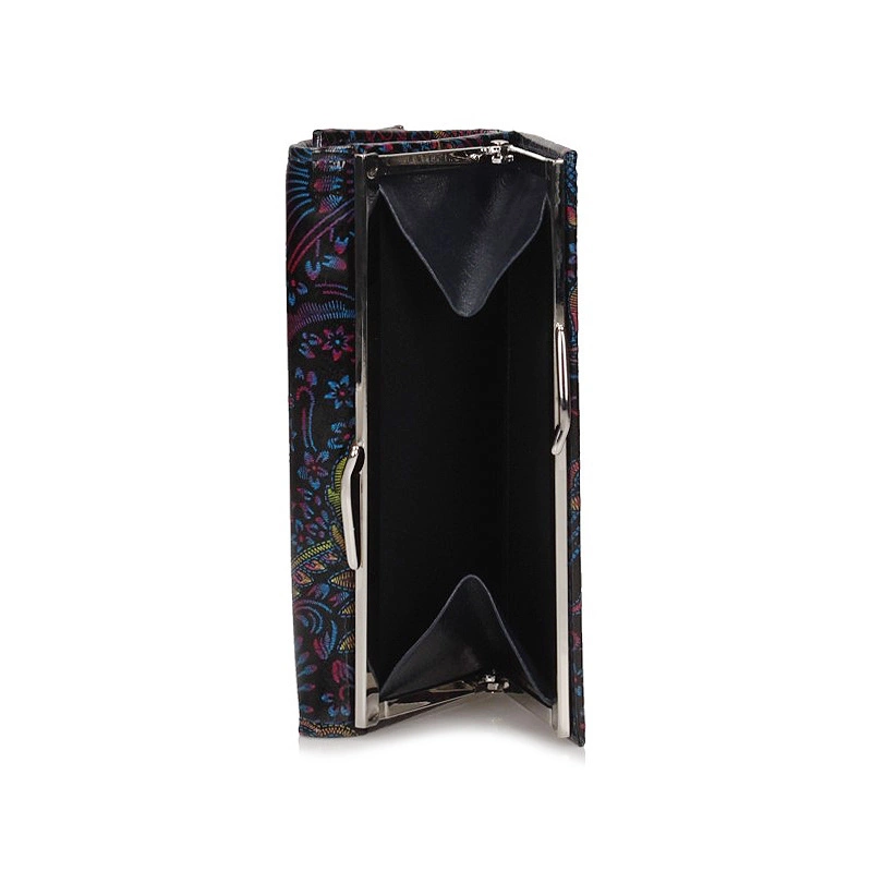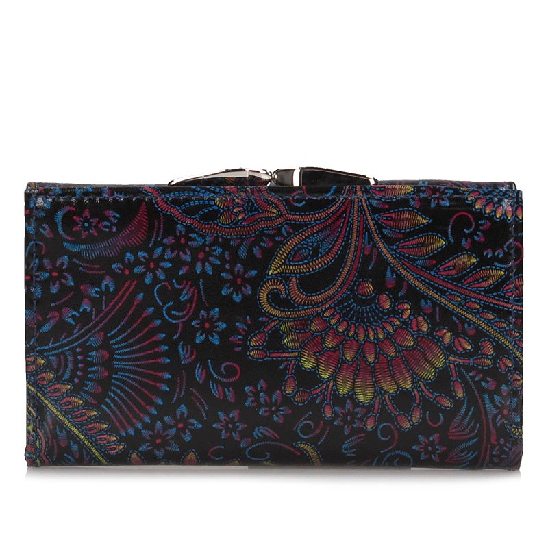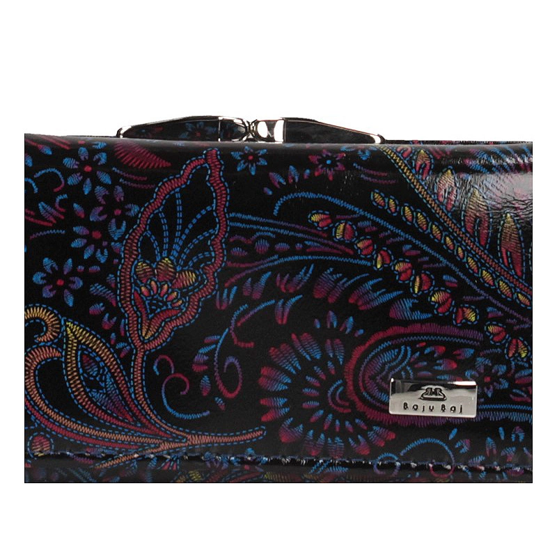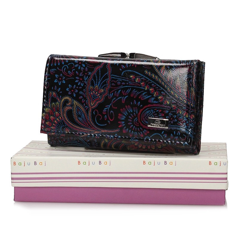 Portfel damski z najnowszej kolekcji przedstawia nam lubiana marka Baju Baj. Model w kolorze czarnym ozdobiony kwiatowym wzorem został wykonany z najwyższej jakości skóry naturalnej. Fason posiada jedną komorę zapinaną na bigiel przeznaczoną na bilon. Druga przegroda zapinana na zatrzask pomieści banknoty, karty i fotografię. Świetny portfel dla Pań w każdym wieku, idealny pomysł na prezent.
