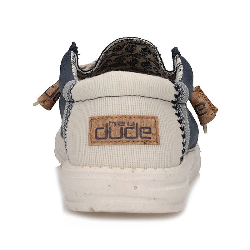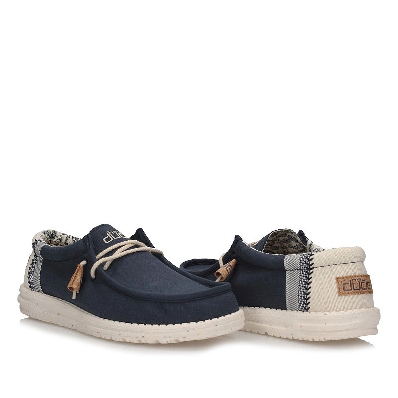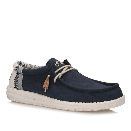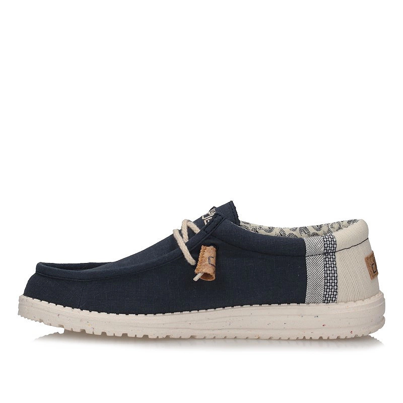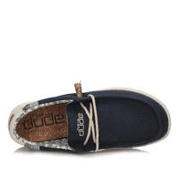Włoska marka Hey Dude zawsze zaskakuje swoich klientów nadzwyczajną wygodą i przyjemnością, jaką dostarcza chodzenie w butach tej firmy. Tym razem propozycja półbutów dla męskiego grona odbiorców wykonana z wysokiej jakości materiału tekstylnego w kolorze granatowym. Wewnątrz znajduje się bardzo miękka skórzana wkładka z możliwością wyjęcia, co pozwala zachować świeżość i czystość przez długi czas. Podeszwę wyprodukowano z lekkiego i elastycznego tworzywa sztucznego. Model ten znakomicie nadaje się do intensywnego użytkowania w ciągu dnia, a oryginalne wzornictwo idealnie wkomponuje się w letnią garderobę każdego mężczyzny.