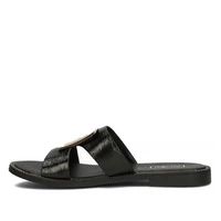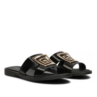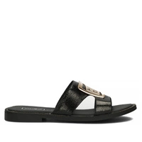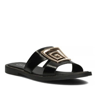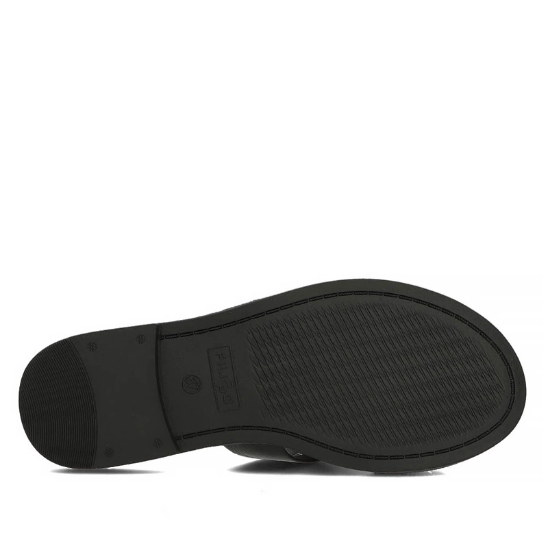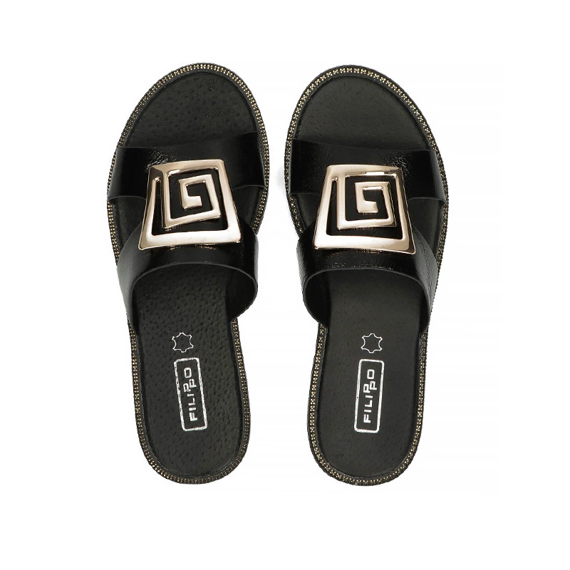 Znana oraz lubiana marka Filippo przedstawia nam klapki z najnowszej kolekcji. Model w kolorze czarnym wykonany został z wysokiej jakości skóry ekologicznej licowej. Delikatna dla stóp wkładka wykonana została z miękkiej skóry naturalnej. Palce odkryty, dzięki czemu możemy swobodnie rozłożyć palce. Cholewka przyozdobiona została ciekawym złotym elementem, który dodaje oryginalnego wyglądu. Podeszwa trwała, odporna na ścieranie.
