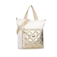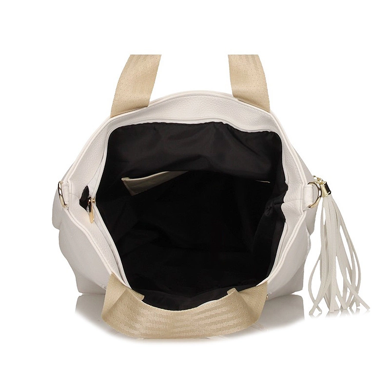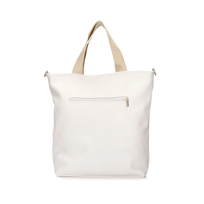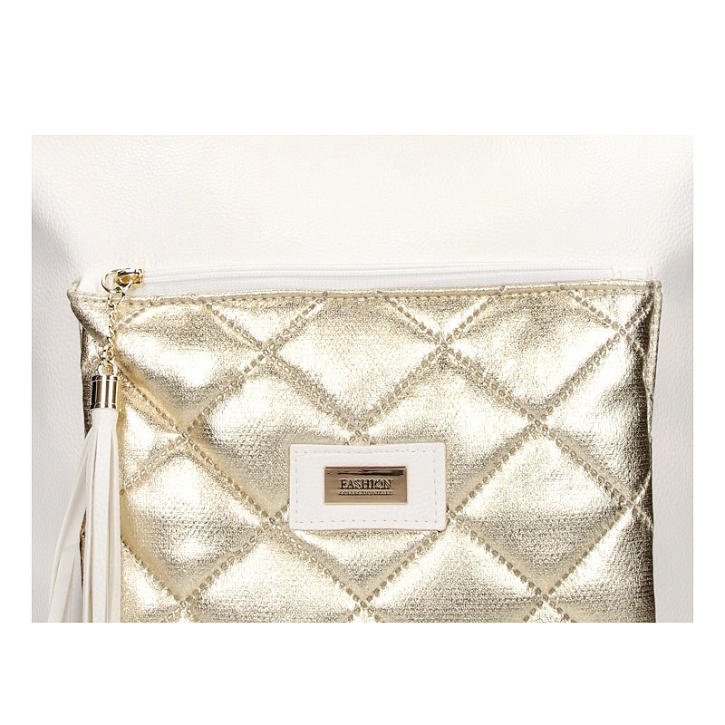 Znana oraz lubiana marka Fashion przedstawia nam torebkę w kolorze biało-złotym z najnowszej kolekcji wiosenno-letniej. Wykonana została z najwyższej jakości skóry ekologicznej. Model jednokomorowy zapinana na zamek, wewnątrz znajduję się kieszonka zapinana na zamek oraz kieszonka bez zamka na kobiece drobiazgi. Na tyle torebki jak i na przodzie znajdują się kieszonki zapinane na zamek. Model posiada możliwość noszenia w ręku oraz został dołączony długi pasek od producenta do noszenia torebki na ramieniu.