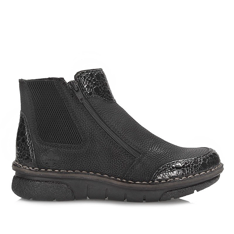 Damskie botki z najnowszej kolekcji jesienno-zimowej prezentuje nam znana oraz ceniona niemiecka marka RIEKER. Obuwie te zostało wykonane z wysokiej jakości skóry ekologicznej w odcieniu klasycznej czerni. Środek wyściełany został czarną naturalną ociepliną, która zapewni nam ciepło w chłodne zimowe dni. Model wyposażony po obu stronach cholewki w zamki, które ułatwiają zakładanie jak i ściąganie. Nosek obuwRieker 53783-14ia zaokrąglony lekko podniesiony ku górze umożliwia swobodne rozłożenie palców. Antypoślizgowa oraz odporna na ścieranie podeszwa została wykonana z wysokiej jakości tworzywa sztucznego. Obuwie dzięki swojemu klasycznemu kolorowi dopasuje się do wielu stylizacji jesienno-zimowych.