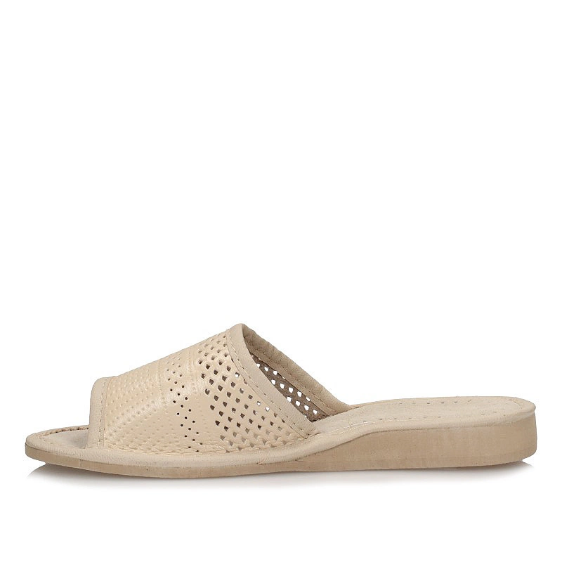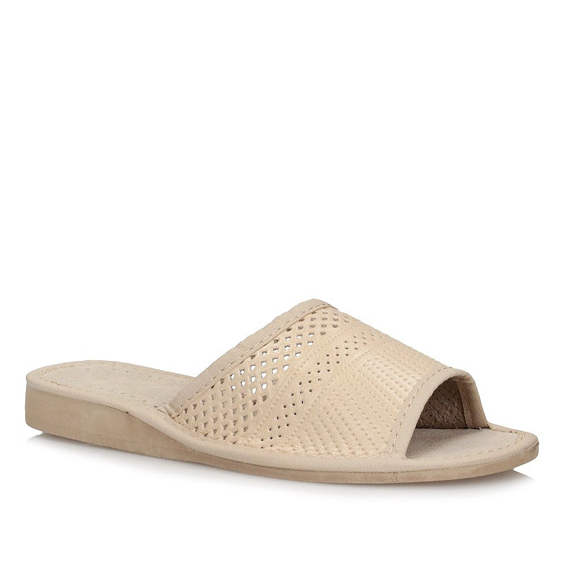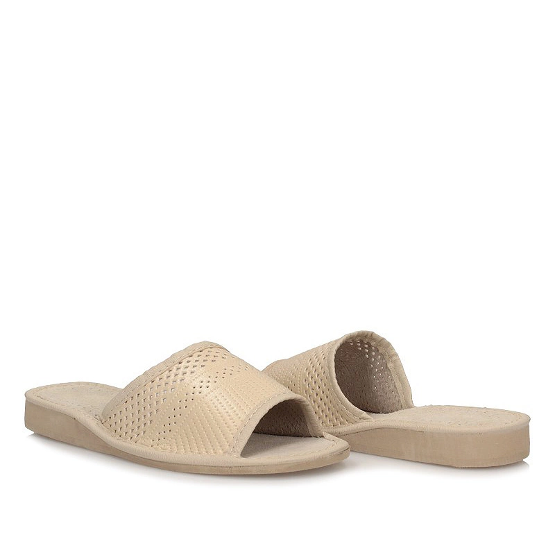 Kapcie domowe damskie z najnowszej kolekcji wiosenno-letniej Model został wykonany z wysokiej jakości skóry naturalnej licowej w kolorze beżowym. Cholewka w motywie ażurowym daję oryginalny wygląd obuwiu. Wkładka została wykonana delikatnej i przyjaznej dla stóp skóry naturalnej w jasnym kolorze. Podeszwa obuwia wykonana z wysokogatunkowego tworzywa sztucznego.