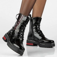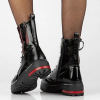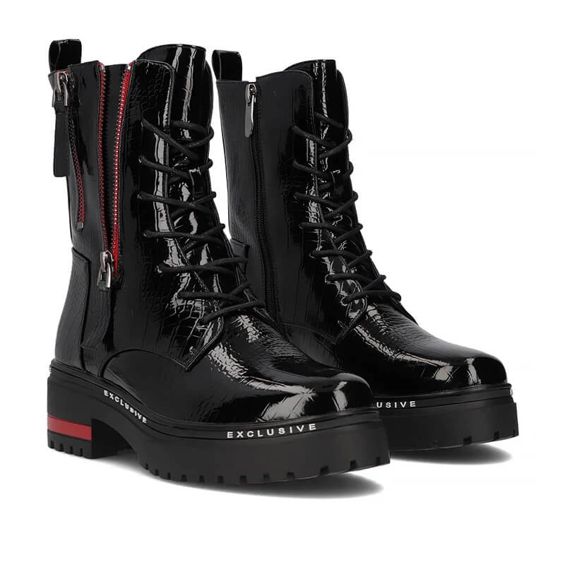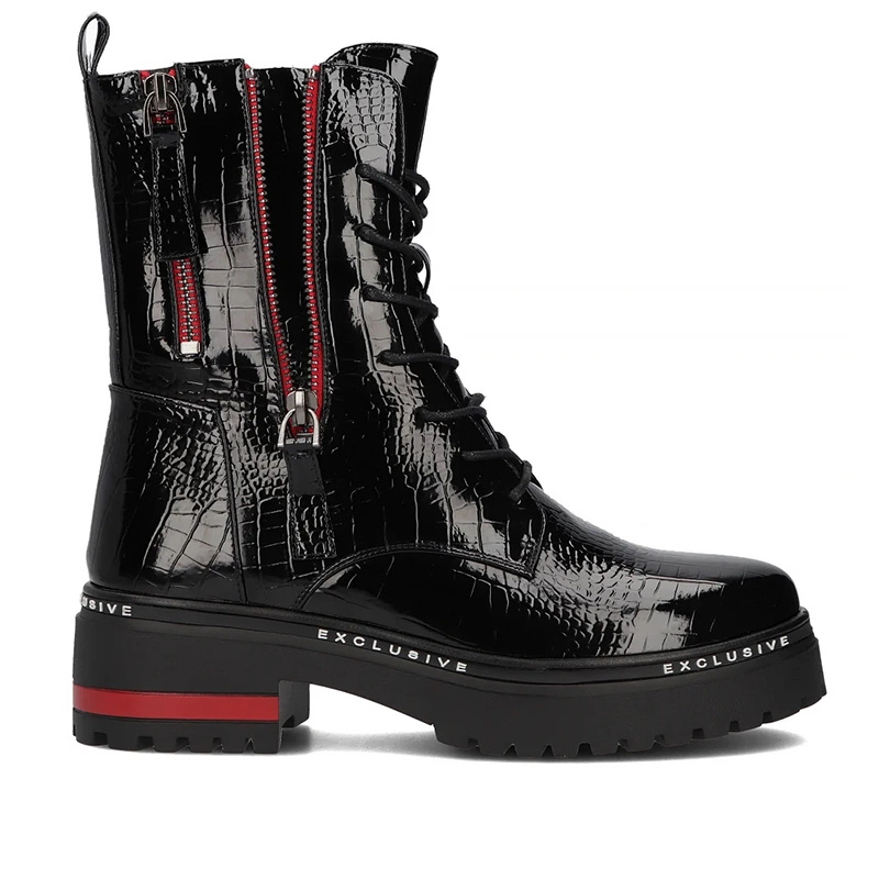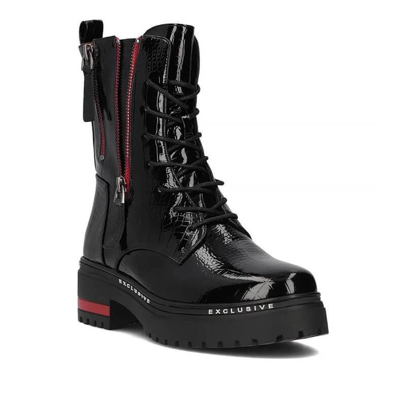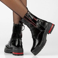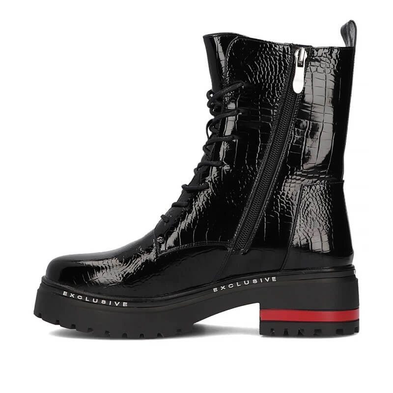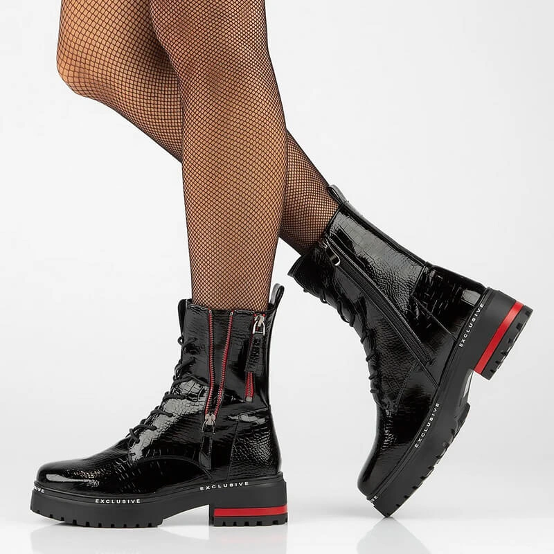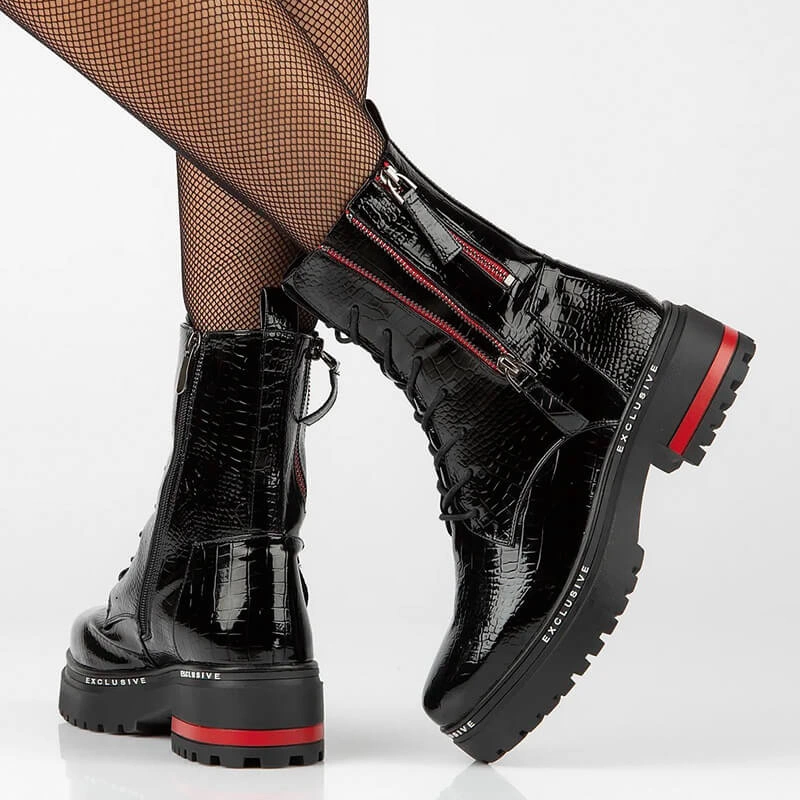 Znana marka Filippo przedstawia nam botki z najnowszej kolekcji jesienno-zimowej. Obuwie w kolorze czarnym połączona z czerwienią. Cholewka obuwia została wykonana ze skóry ekologicznej lakierowanej. Nosek obuwia o okrągłym kształcie. Wkładka wykonana z wysokiej jakości tkaniny. Botki posiadają zapięcie na zamek oraz tradycyjne sznurowanie, które pozwoli na szybkie i bezproblemowe zakładanie obuwia. Podeszwa na platformie, która wynosi 5,5 cm. Obuwie dzięki swojemu klasycznemu kolorowi dopasujemy do wielu stylizacji.