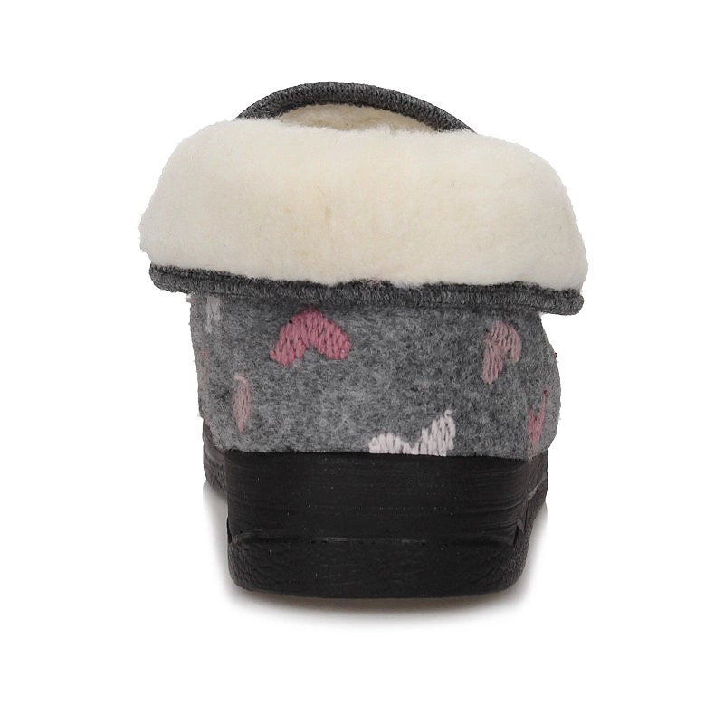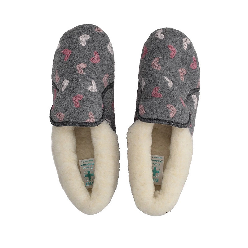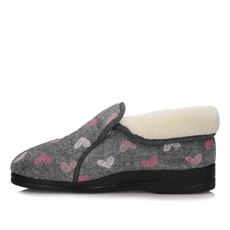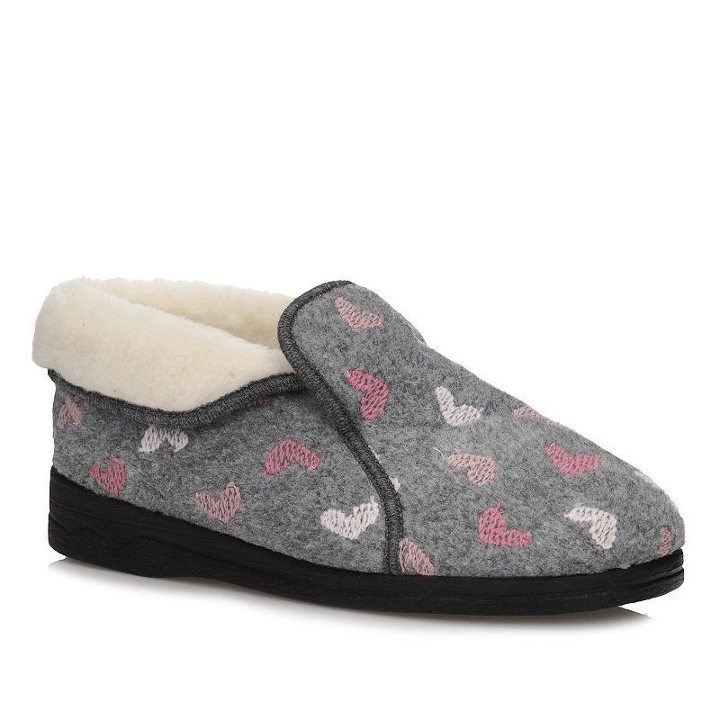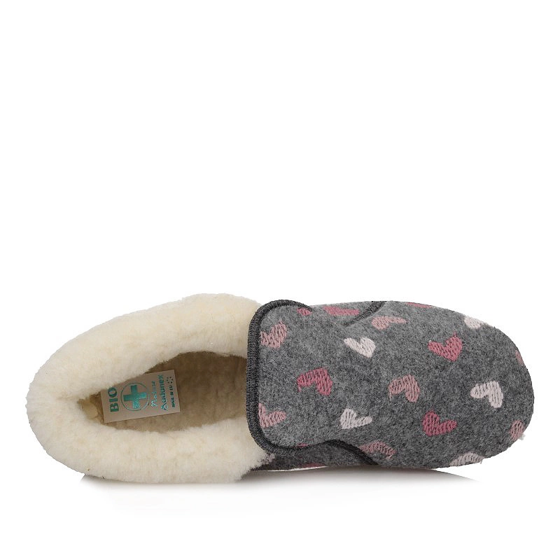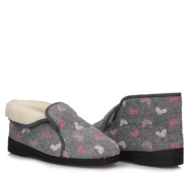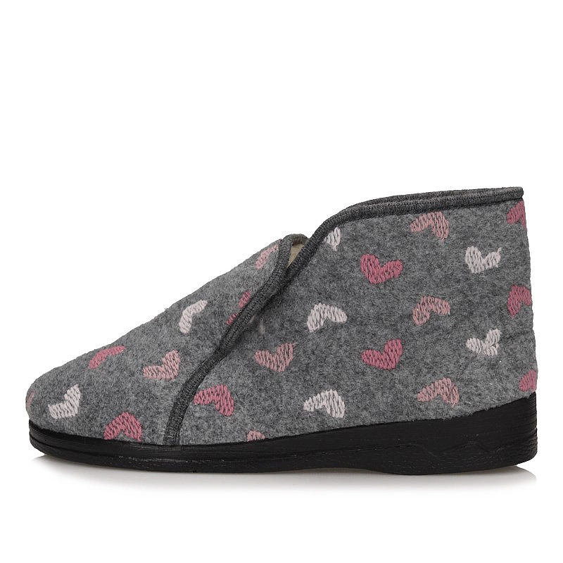 Znana marka Adanex przedstawia nam bambosze damskie . Cholewka obuwia została wykonana z materiału tekstylnego. Nosek obuwia okrągły, pozwalający swobodnie rozłożyć palce. Wkładka wykonana została z ociepliny. Bambosze wsuwane co pozwoli nam na szybkie i bezproblemowe zakładanie. Model ten został ozdobiony wzorem w serduszka. Podeszwa wykonana z trwałego tworzywa sztucznego. Bambosze dzięki swojemu klasycznemu kolorowi spodobają się wielu panią.