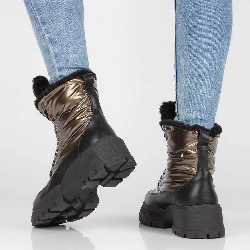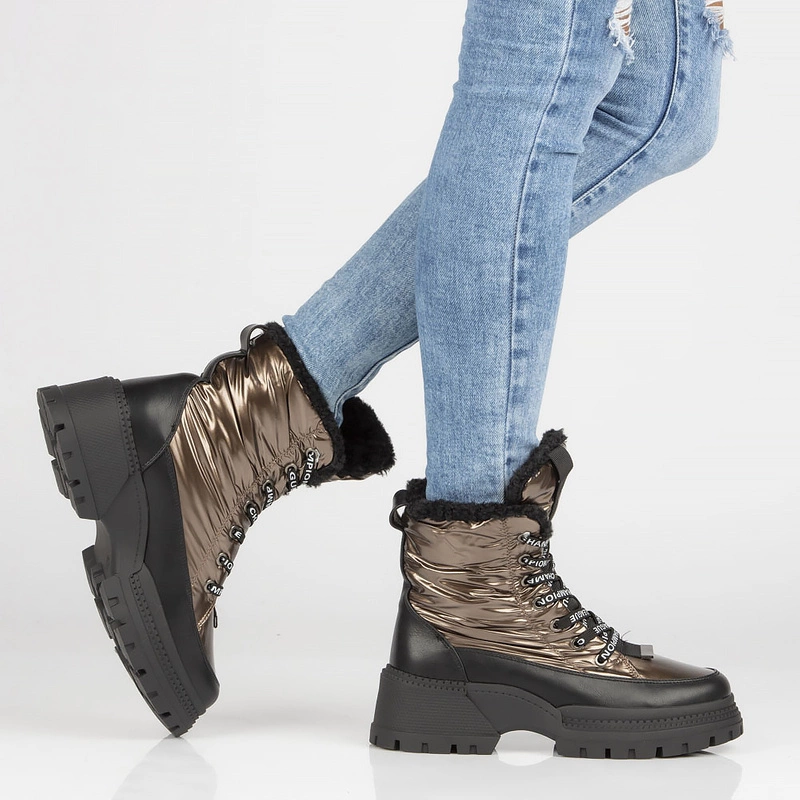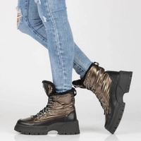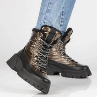 Znana marka Filippo przedstawia nam botki damskie w kolorze czarno-złotym kolekcji jesienno-zimowej. Cholewka obuwia została wykonana ze skóry ekologicznej. Nosek obuwia szeroki, pozwalający swobodnie rozłożyć palce. Wkładka wykonana z materiału tekstylnego. Tradycyjne sznurowanie umożliwia idealne dopasowanie obuwia do tęgości stóp. Podeszwa na platformie wykonana z trwałego tworzywa sztucznego. Model botków, który sprawdzi się w wielu stylizacjach jesienno-zimowych.