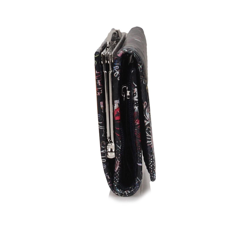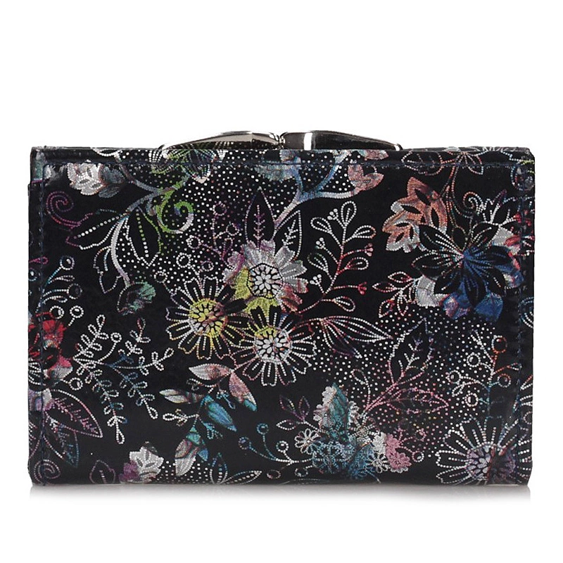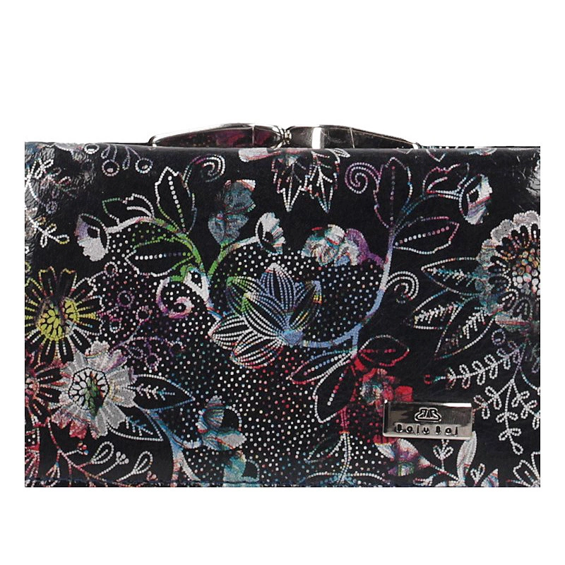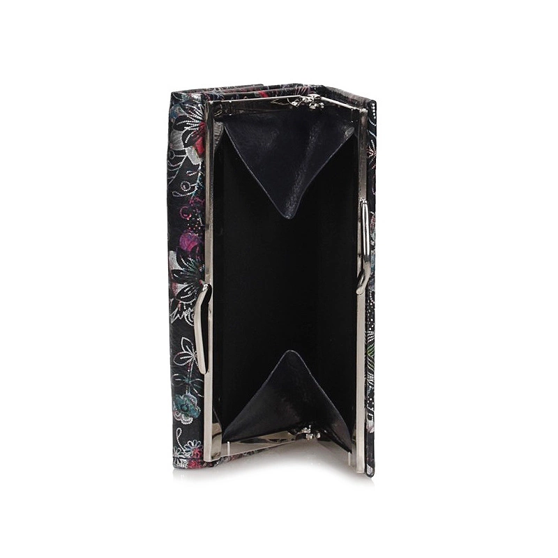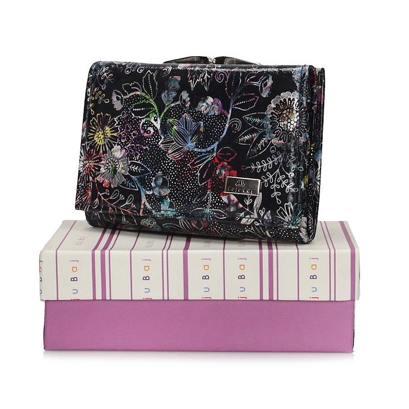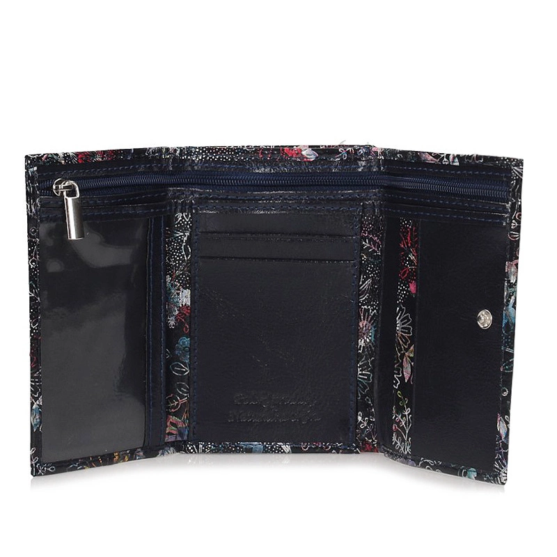 Najnowsza propozycja portfela damskiego od polskiej marki Baju Baj. Całość wykonana została z naturalnej skóry w ciemno granatowym odcieniu. W środku producent umieścił przegródki na karty oraz na zdjęcie. Kieszeń na drobne zapinana za srebrny bigiel. Kwiatowy nadruk dodaje oryginalnego wyglądu.