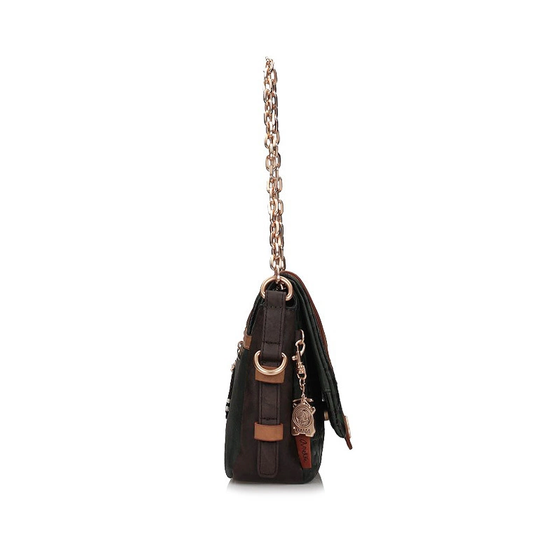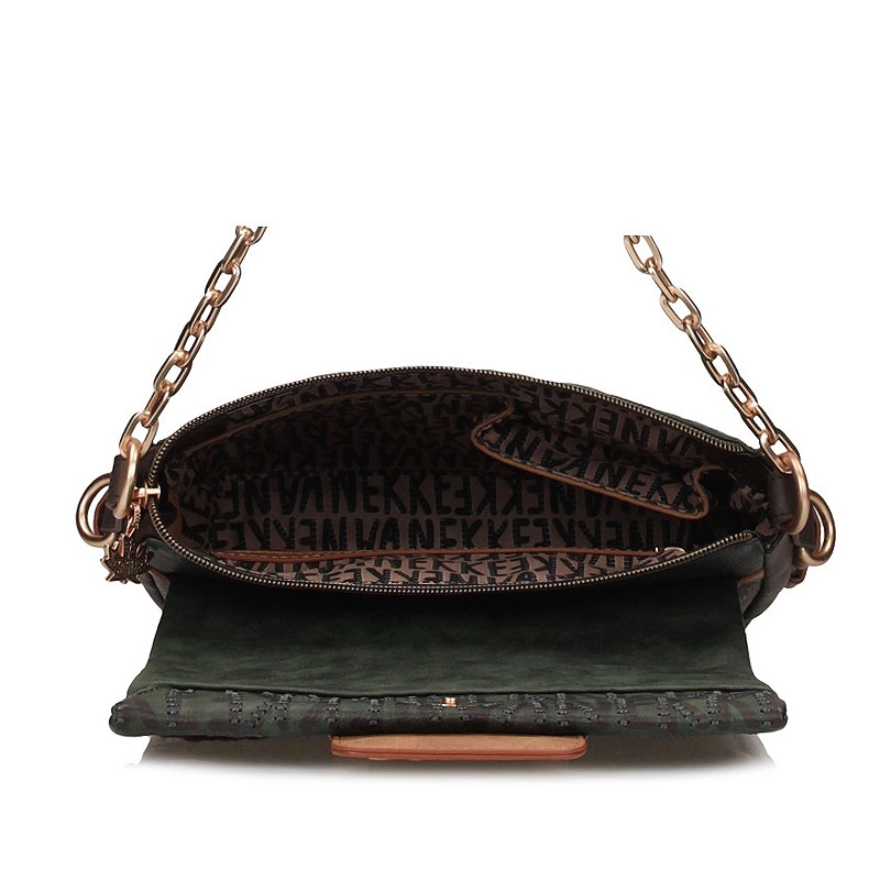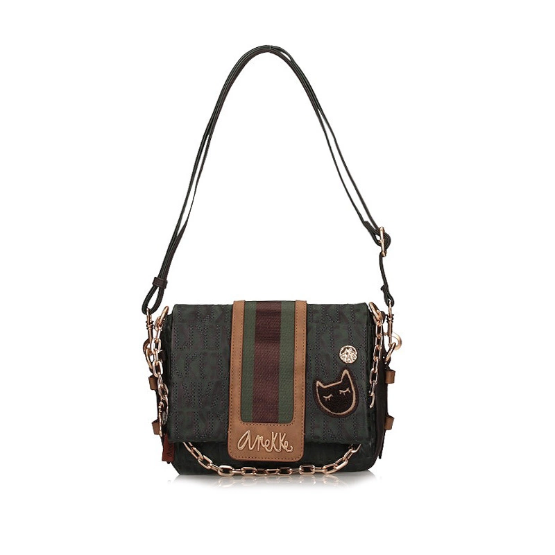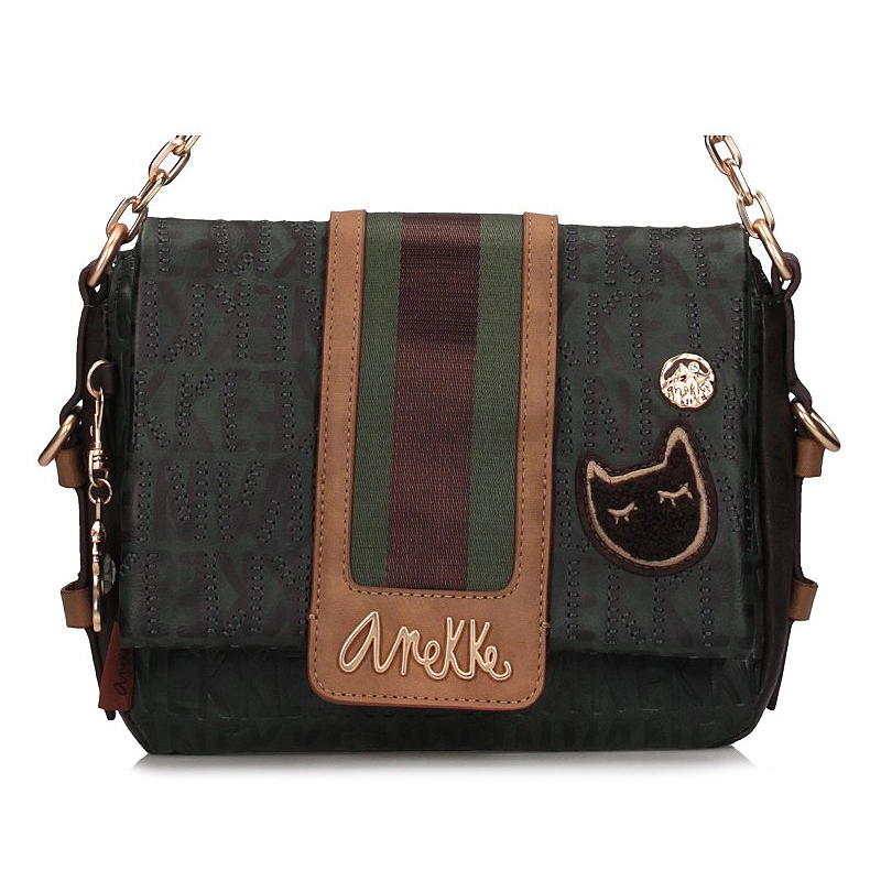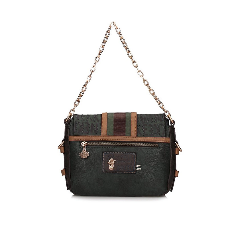 Torbę z najnowszej kolekcji jesienno-zimowej przedstawia nam lubiana oraz ceniona hiszpańska marka Anekke. Fason wykonany został z najwyższej jakości skóry ekologicznej licowej w kolorze butelkowej zieleni z elementami czerni i brązu. Fason jednokomorowy, zapinany na zamek. Wewnątrz umieszczono kieszonkę zapinaną na zamek i kieszonkę na telefon. Całość zamykana na klapę z magnesem. Środek wyściełany drukowaną tkaniną, nawiązująca kolorystycznie i tematycznie do strony zewnętrznej. Z tyłu torebki również umieszczono kieszonkę zapinaną na zamek. Na przodzie torebki producent umieścił logo firmy. Torebka wyposażona w złoty łańcuszek co dodaje elegancji. Model z pewnością skradnie serce nie jednej kobiecie.