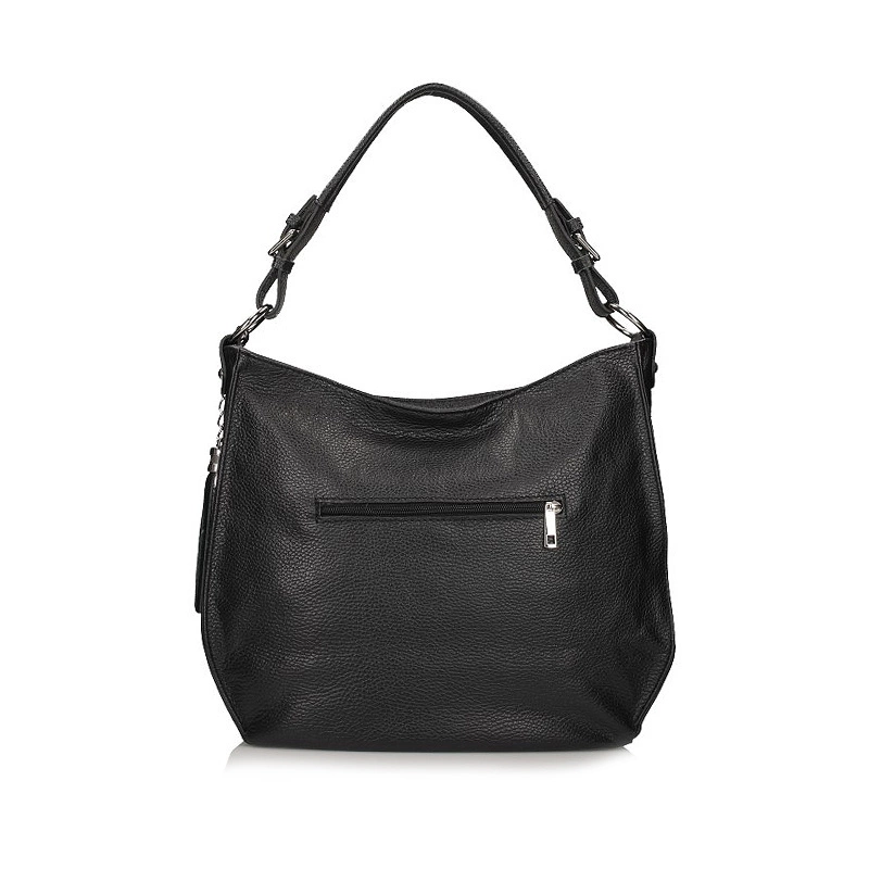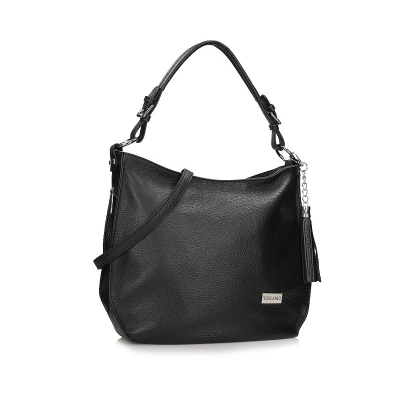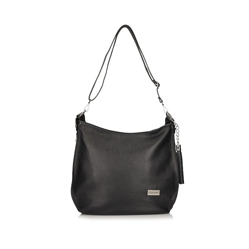 Znana oraz ceniona włoska marka Toscanio prezentuje nam torebkę z najnowszej kolekcji jesienno-zimowej. Model został wykonany z wysokiej jakości skóry naturalnej licowej w czarnym odcieniu. Jednokomorowa zapinana na wygodny w użytkowaniu zamek. Wewnątrz mieści się się organizer zapinany na zamek oraz kieszonka na telefon lub kobiece drobiazgi. Z tyłu torebki znajduje się dodatkowa kieszeń zapinana na zamek. Producent dołączył również długi, regulowany pasek, który dostosuje się do naszych potrzeb.