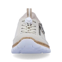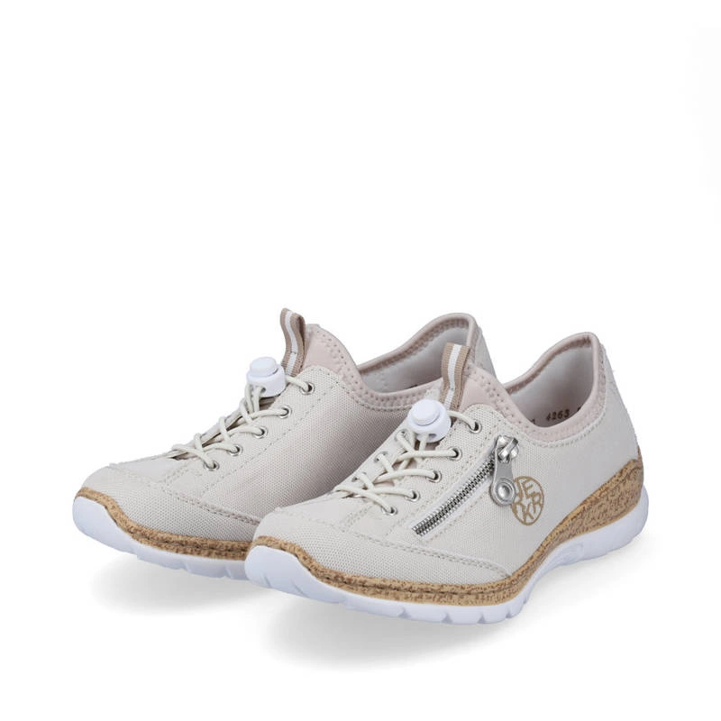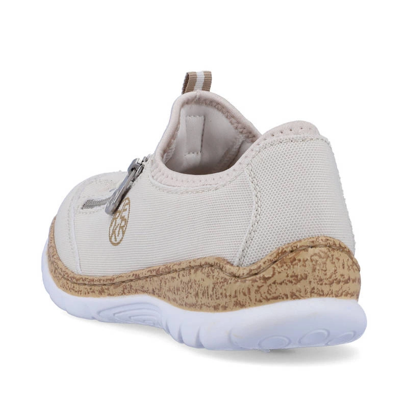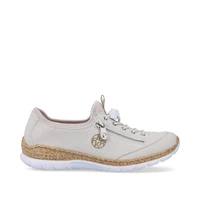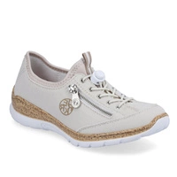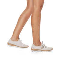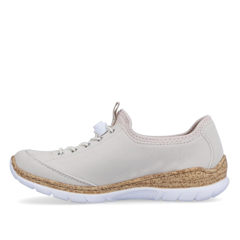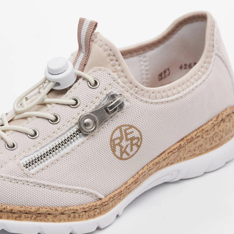 Obuwie damskie znanej nam marki Rieker z najnowszej kolekcji wiosenno-letniej. Model ten został wykonany z wysoko gatunkowej tkaniny w odcieniach białym i beżowym. Wnętrze obuwia wyściełane jest miękką tkaniną. Miękka wkładka, zapewni wygodę podczas użytkowania. Sznurowanie na 5 dziurek umieszczone na cholewce zapewni odpowiednie dopasowanie obuwia do różnej tęgości stopy. Podeszwa o wysokości 3 cm jest antypoślizgowa oraz odporna na ścieranie. Wykonana z wysokogatunkowego tworzywa sztucznego. Idealnie sprawdzą się w codziennym użytkowaniu.