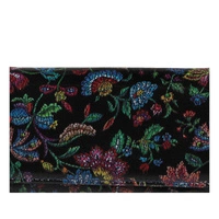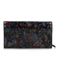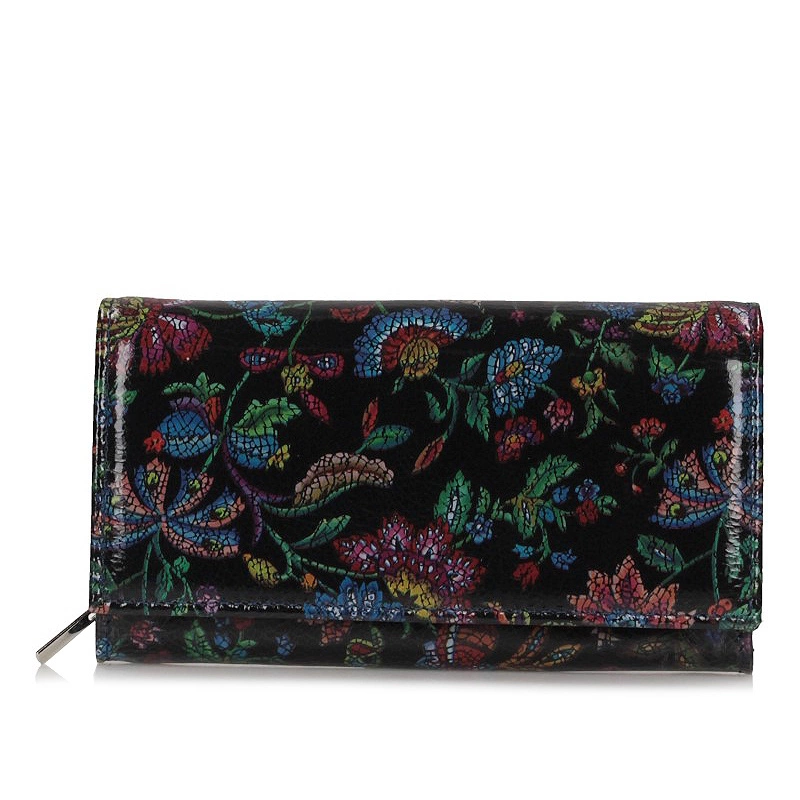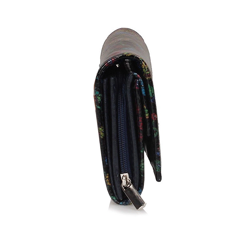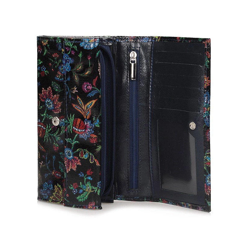 Polska marka Baju Baj prezentuje najnowszy model portfela damskiego. Fason w całości został wykonany z najwyższej jakości skóry naturalnej w czarnym kolorze z ciekawym nadrukiem. Model posiada klapkę zapinana na zatrzask. Wewnątrz znajdują się miejsce na banknoty, zdjęcia, karty kredytowe, oraz przegródka na bilon zapinana na zamek błyskawiczny. Model z pewnością spodoba się Paniom w każdym wieku. Wymiary: wysokość: 9 cm szerokość: 16 cm.