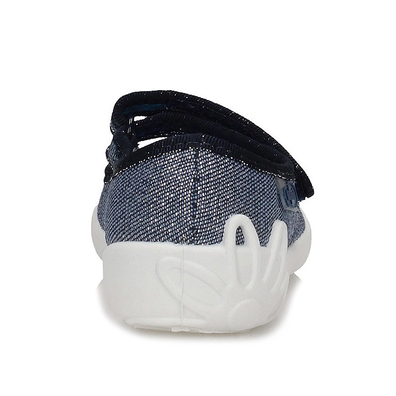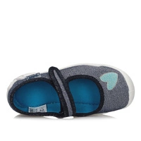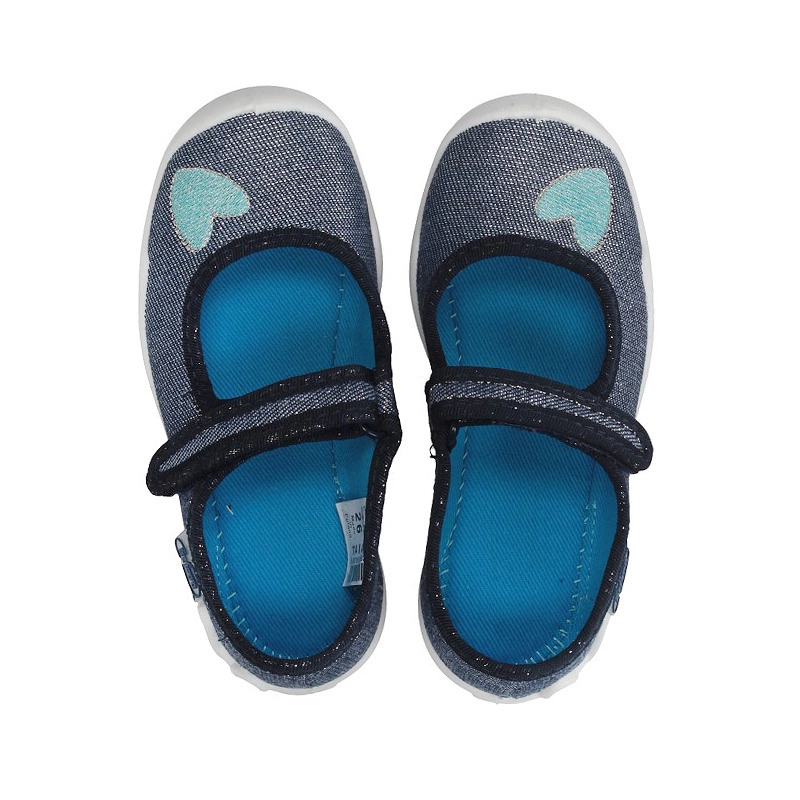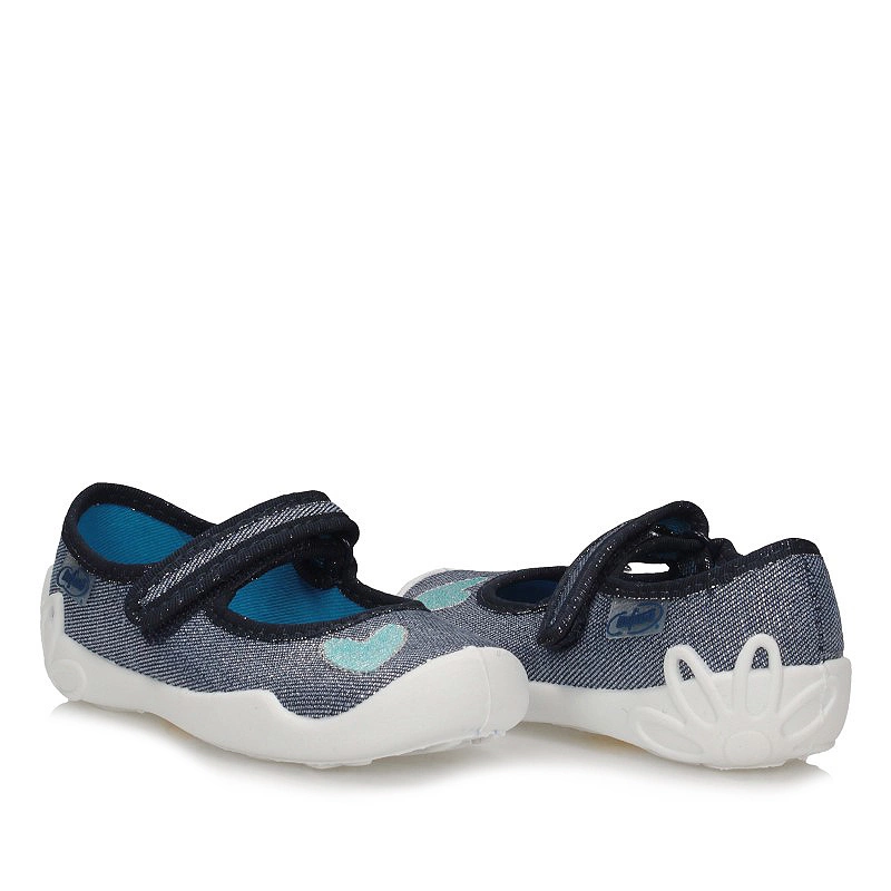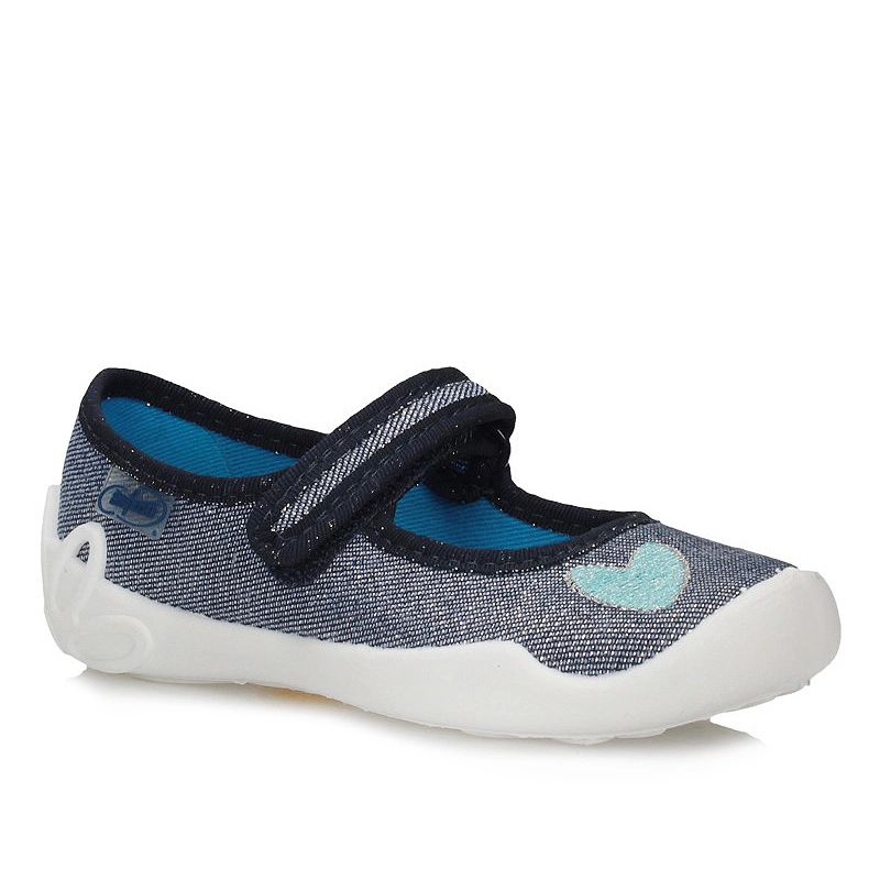 Znana oraz lubiana marka Befado przedstawia nam kapcie dziewczęce z najnowszej kolekcji wiosenno-letniej . Model w kolorze niebieskim wykonany został z wysokiej jakości materiału tekstylnego. Delikatna dla stóp wkładka wykonana została z miękkiej tkaniny. Nosek zaokrąglony, lekko uniesiony ku górze, dzięki czemu możemy swobodnie rozłożyć palce. Obuwie zapinane na błyskawiczny rzep. Buciki ozdobione niebieskim serduszkiem.