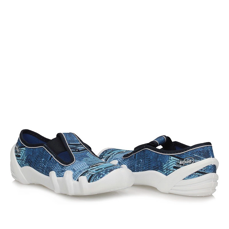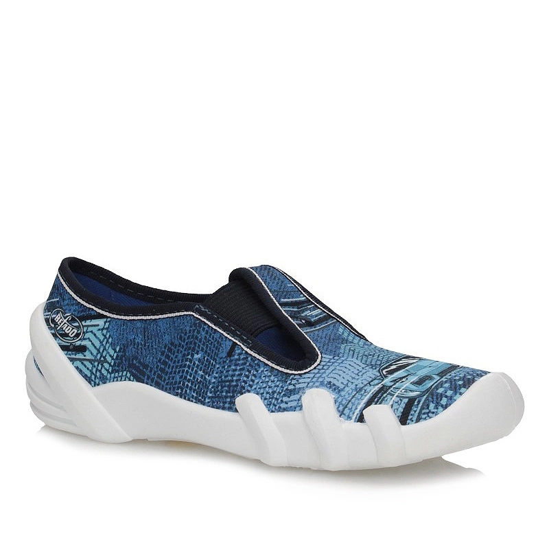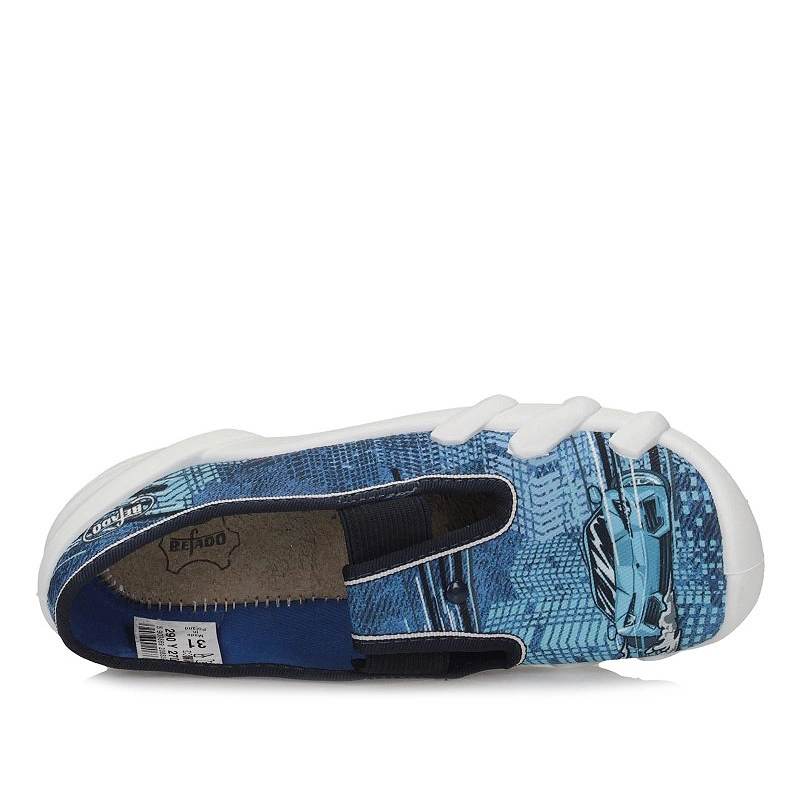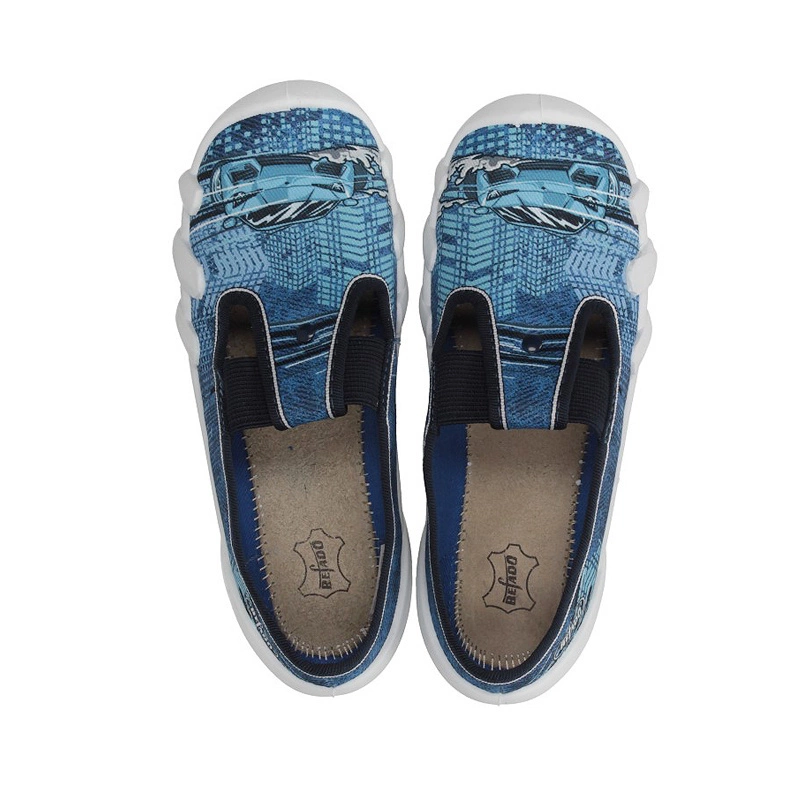 Najnowsza propozycja polskiej firmy Befado dla najmłodszych. Całość wykonana została z przyjemnej w dotyku tkaniny w odcieniach niebieskiego. Miękka wkładka zapewni wygodę oraz komfort podczas użytkowania. Gumowa podeszwa odporna na ścieranie. Wzór samochodu na cholewce dodają obuwiu nietuzinkowego wyglądu.