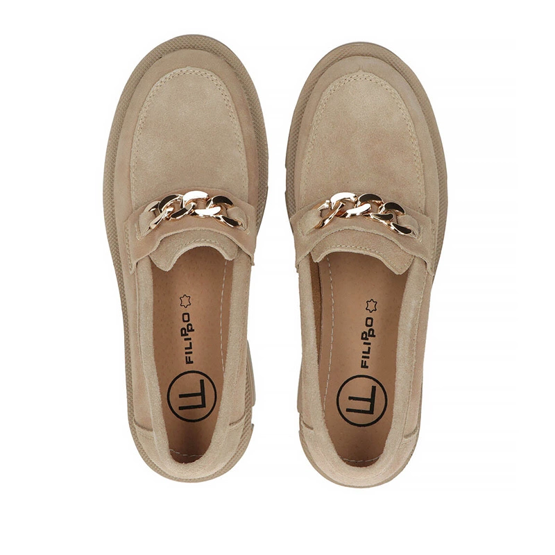 Marka Filippo w tym sezonie stawia na klasykę połączoną z oryginalnością. Nowy model półbutów wykonany został wysokiej jakości skóry naturalnej. Wnętrze wyściełano również skórą naturalną. Na cholewce znajduje się ozdobny czarny łańcuch, który nadaje półbutom charakterystycznego i nietuzinkowego wyglądu. Obuwie wsuwane, które umożliwi nam szybkie zakładanie oraz zdejmowanie. Odporna na ścieranie podeszwa została wykonana z trwałego tworzywa sztucznego. Mokasyny idealnie sprawdzą się w wielu damskich stylizacjach.